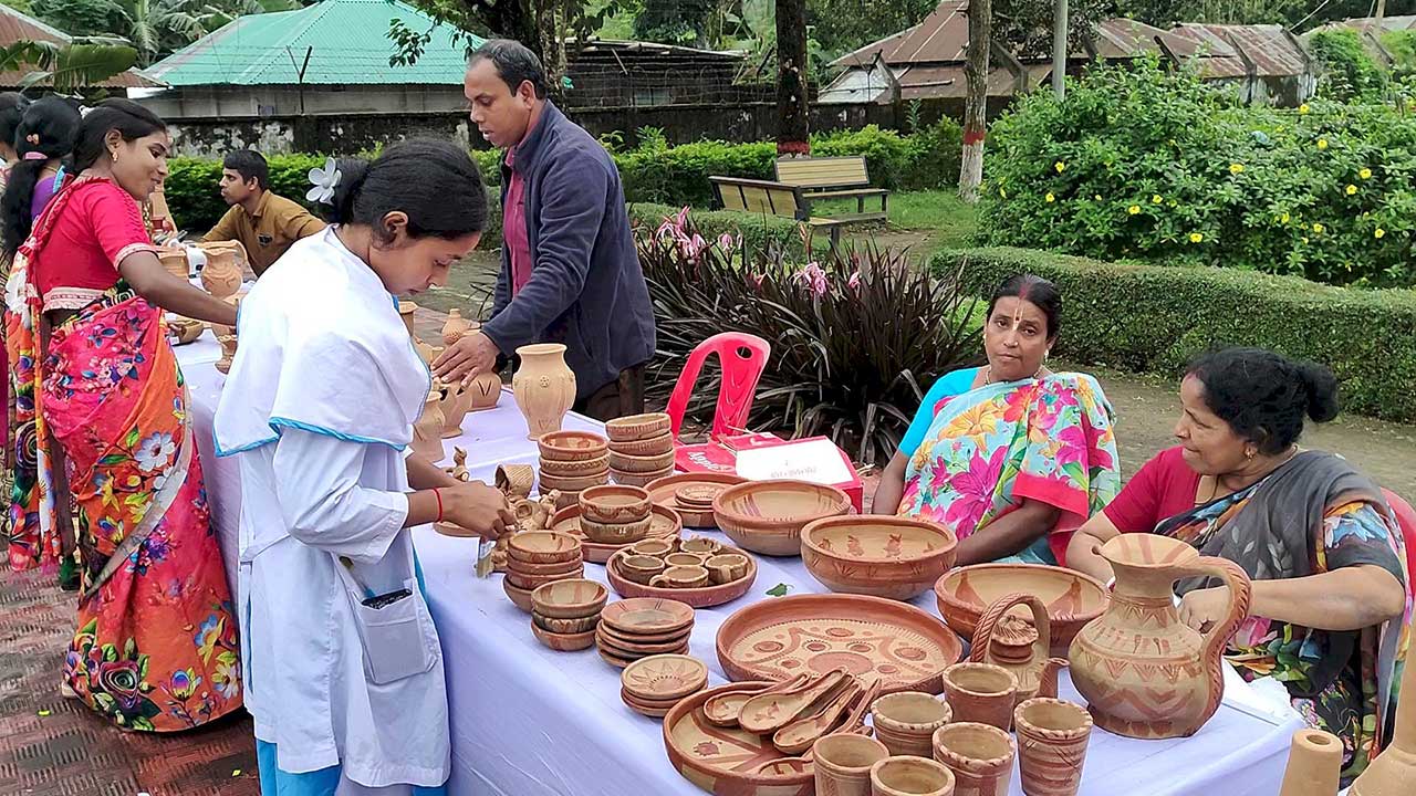 ডিসি পর্যটন পার্কের মাঠজুড়ে সাজানো স্টলগুলোতে ছিল নানা আকৃতির ফুলদানী, মাটির হাঁড়ি-পাতিল, প্রদীপ, খেলনা, গৃহসজ্জার উপকরণসহ নিত্যব্যবহার্য পণ্য। হাতে তৈরি প্রতিটি জিনিসে ফুটে উঠেছে শিল্পীদের সৃজনশীলতা ও ঐতিহ্যের ছাপ। দর্শনার্থীরা কেউ ছবি তুলেছেন, কেউবা কিনে নিয়েছেন পছন্দের পণ্য। মেলায় অংশ নেয় স্থানীয় স্কুল-কলেজের শিক্ষার্থীরাও।