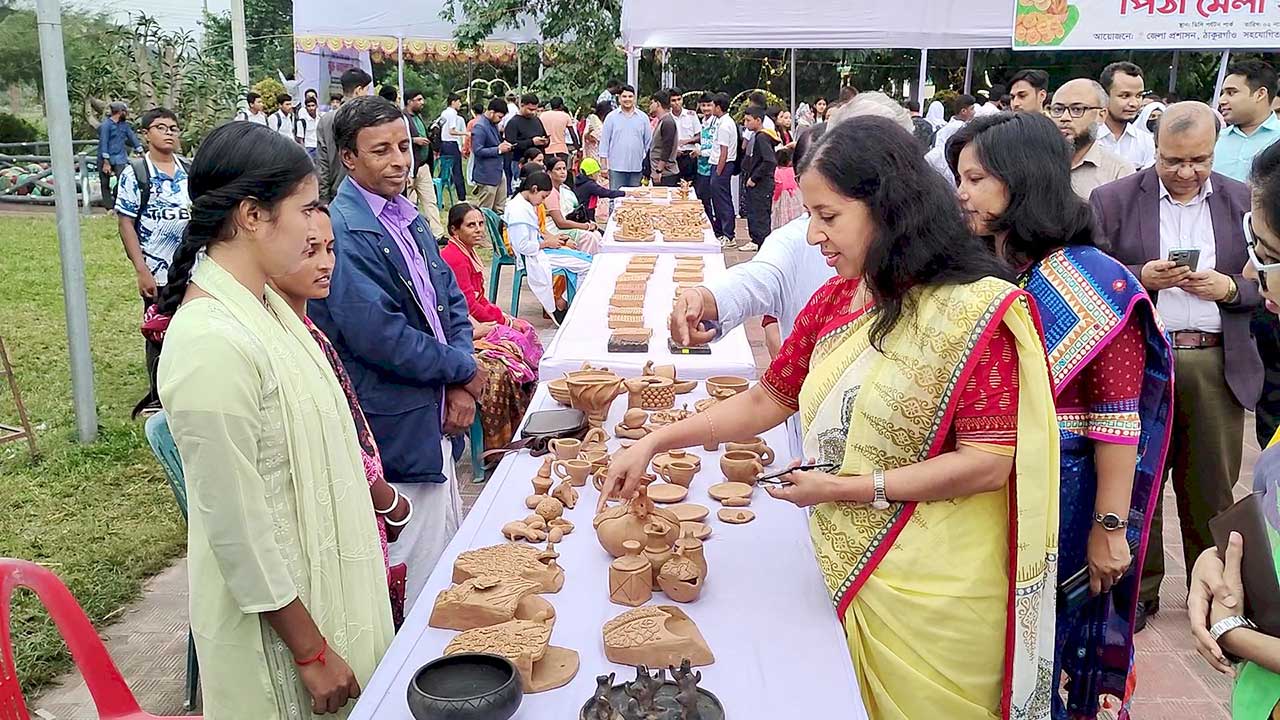পাশাপাশি, পিঠা মেলায় ছিল একেবারে গ্রামীণ স্বাদ। দুধচিড়ার ঘ্রাণ, পাটিসাপটার মিষ্টি রস আর খেজুরের গুড়ের সুবাসে চারদিক মুখরিত। জেলার বিভিন্ন নারী উদ্যোক্তা ও সংগঠন পিঠার স্টল সাজিয়েছেন নিজেদের মতো করে। দিনের শেষে সূর্য যখন ডিসি পার্কের গাছের মাথায় হেলে পড়েছে, তখনও দর্শনার্থীদের ভিড় ছিল অটুট। কেউ ব্যস্ত পিঠার স্বাদ নিতে, কেউ মাটির পণ্য হাতে নিয়ে হাসিমুখে ছবি তুলছেন। সেই হাসিই যেন জানিয়ে দিচ্ছিল ঐতিহ্য এখনো মরে যায়নি, শুধু একটু যত্ন আর উদ্যোগই পারে তাকে নতুন প্রাণ দিতে।