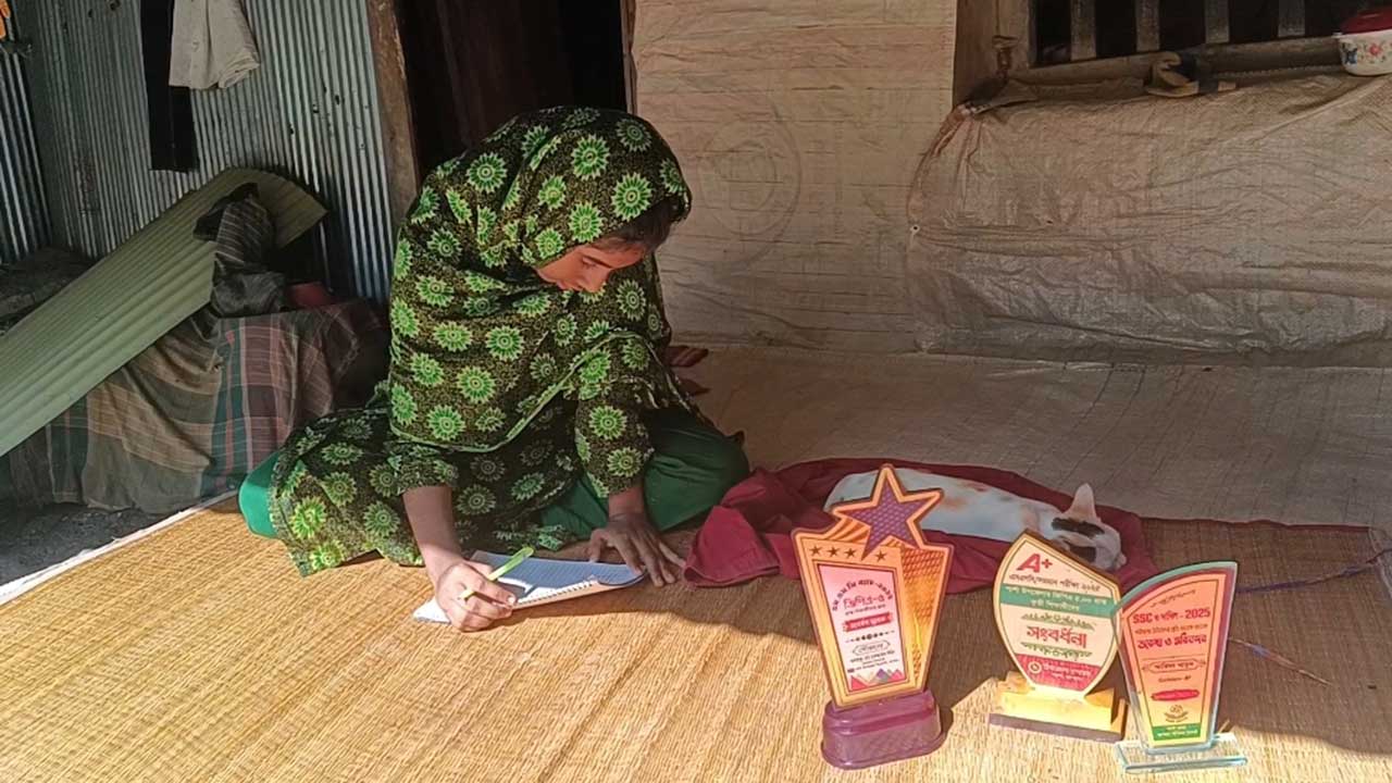 মাত্র একটি ভাঙাচোরা মাটির ঘরে আশ্রয় আরিফাদের। দেয়ালে ফাঁটল, টিনের চাল দিয়ে পানি পড়ে ভেতরে। নেই ফ্যান, নেই পড়ার টেবিল। পড়াশোনার ন্যূনতম ব্যবস্থাও নেই। এমন পরিবেশেও কেরোসিনের ক্ষীণ আলোয় রাতভর পড়ে আরিফা। চোখে আলো কম, কিন্তু মনোবলে কখনও আঁধার নামতে দেননি।