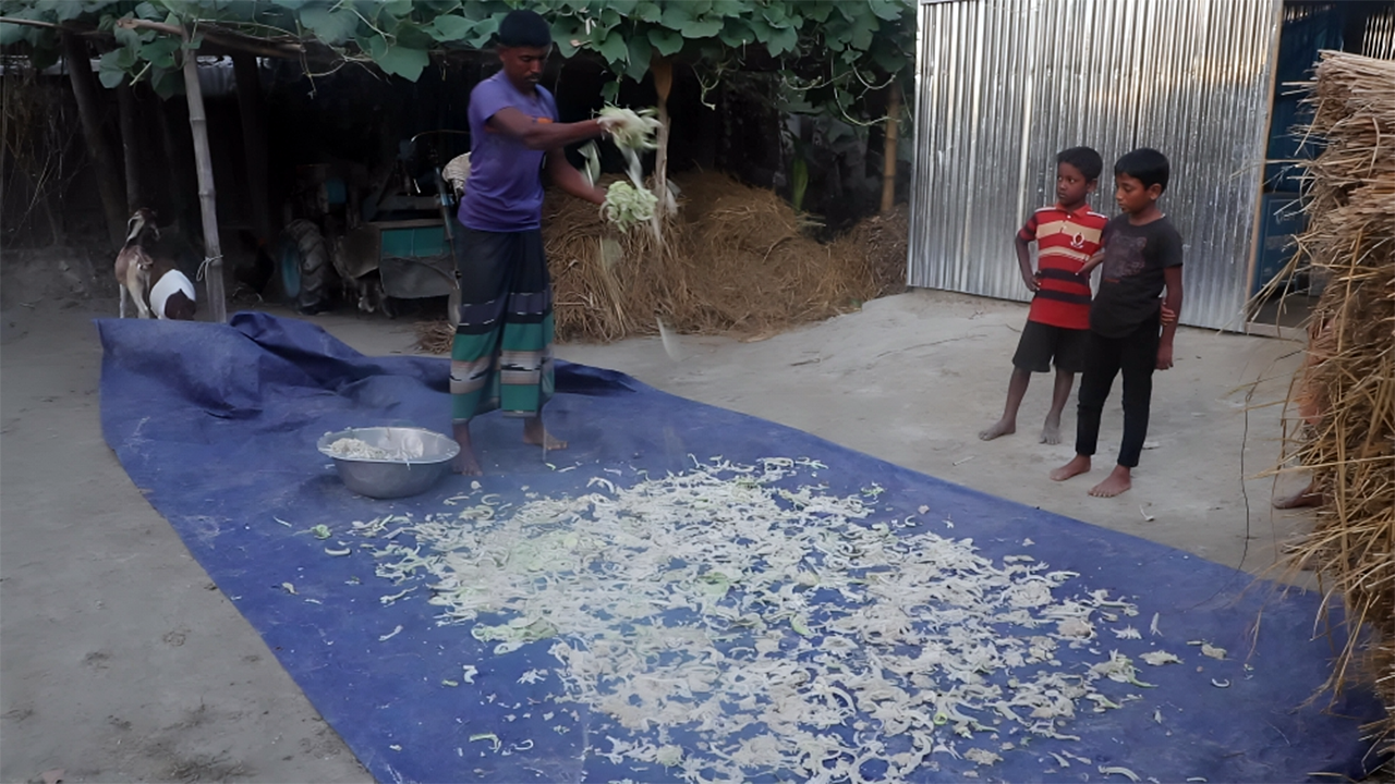 সরেজমিনে আইয়ুব খানের বাড়িতে গেলে দেখা যায়, উঠানজুড়ে সারিবদ্ধভাবে শুকানো হচ্ছে কাটা কলাগাছের টুকরো। ঘরের ভেতরে চলছে যান্ত্রিকভাবে কাটাকাটির কাজ। পাশে স্ত্রী, মা এবং ছেলে—সবাই মিলে ব্যস্ত সময় পার করছেন।