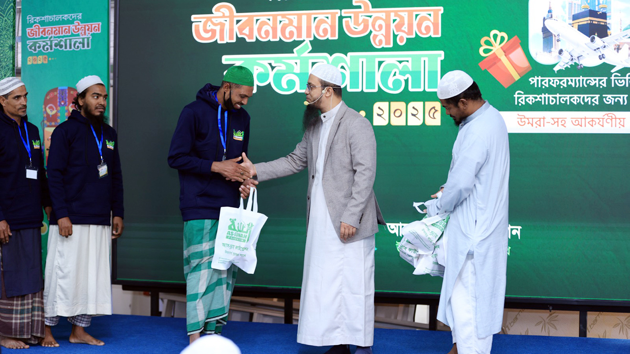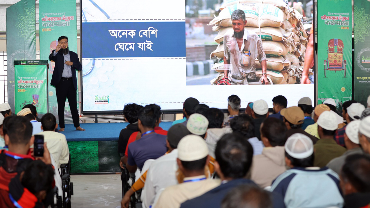 রিকশাচালকদের জীবনমান উন্নয়ন, সচেতনতা বৃদ্ধি ও কর্মক্ষেত্রে ইতিবাচক পরিবর্তন আনার লক্ষ্যে আস-সুন্নাহ ফাউন্ডেশনের উদ্যোগে রিকশাচালকদের নিয়ে ‘জীবনমান উন্নয়ন কর্মশালা’ অনুষ্ঠিত হয়েছে।