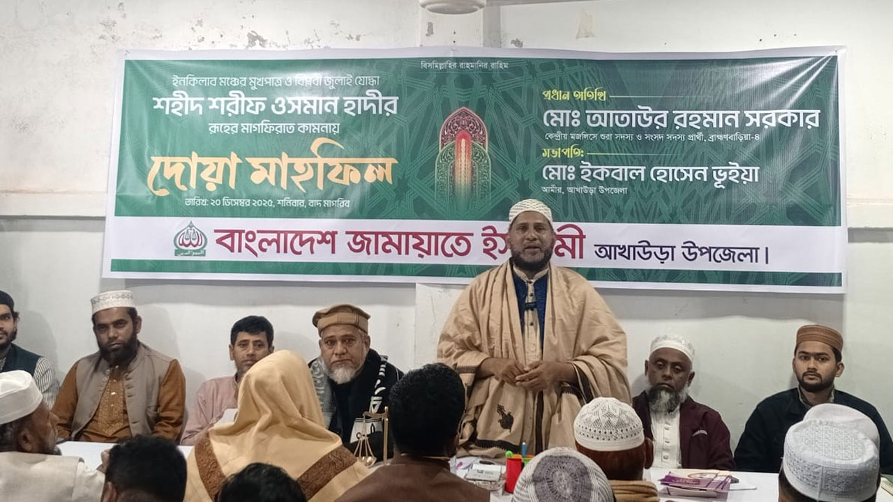 শনিবার (২০ ডিসেম্বর) সন্ধ্যা ৬টার দিকে ব্রাহ্মণবাড়িয়ার আখাউড়া উপজেলা জামায়াতে ইসলামী আয়োজিত ইনকিলাব মঞ্চের মুখপাত্র ও বিপ্লবী জুলাই যোদ্ধা শহীদ শরিফ ওসমান হাদির রুহের মাগফেরাত কামনায় দোয়া মাহফিলে তিনি এসব কথা বলেন।