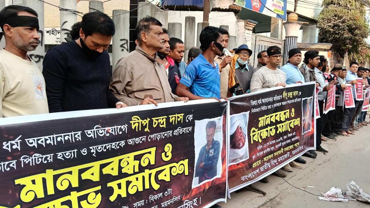 রোববার (২১ ডিসেম্বর) বিকেল ৪টায় ময়মনসিংহ নগরীর শহীদ ফিরোজ-জাহাঙ্গীর চত্বরে সচেতন সনাতনী সমাজের ব্যানারে আয়োজিত এক মানববন্ধনে তিনি এই অভিযোগ করেন।