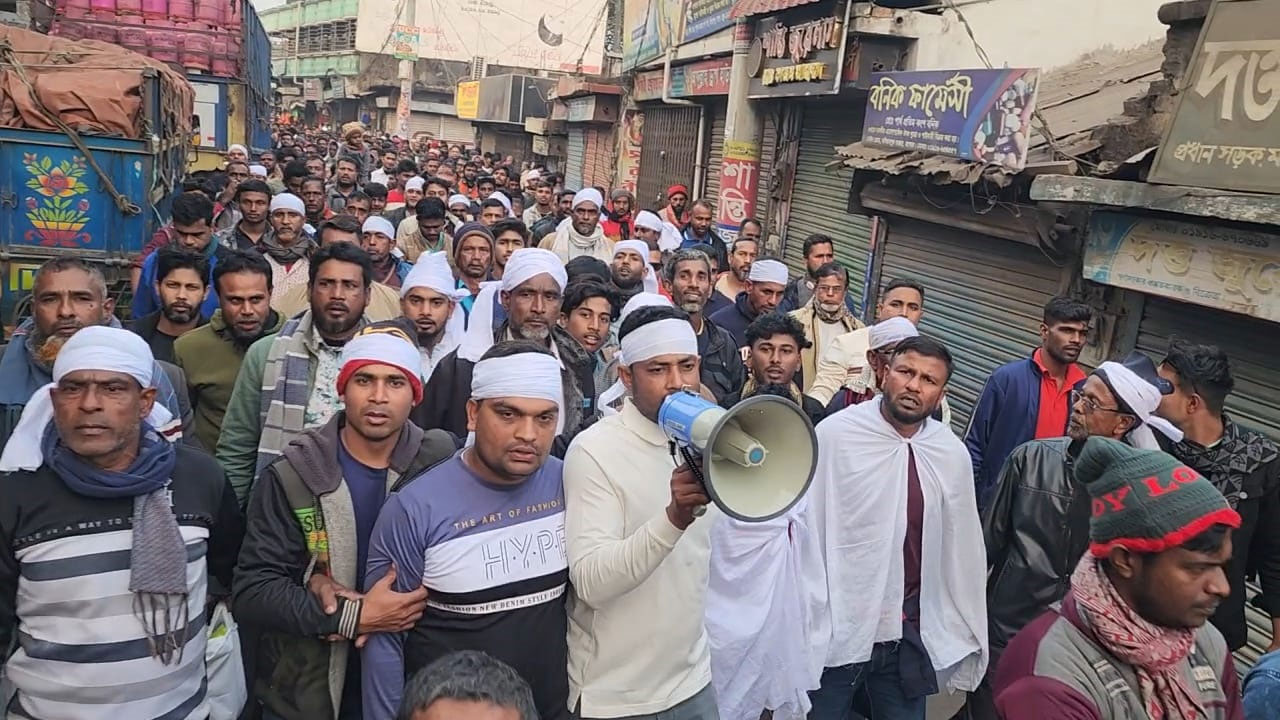 শহীদ ইকবালকে বিএনপির মনোনয়ন ফিরিয়ে দিতে মাথায় কাফনের কাপড় বেঁধে বিক্ষোভ