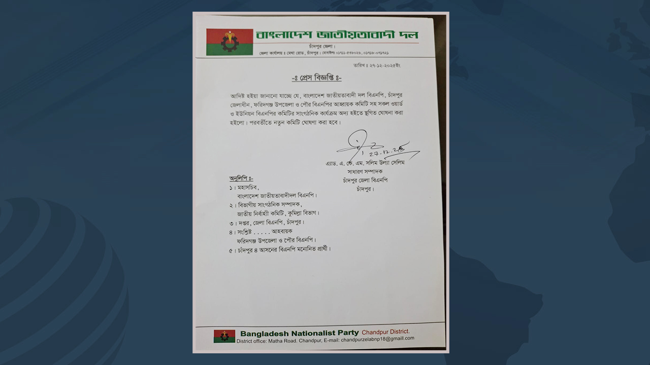 চিঠিতে উল্লেখ করা হয়, ফরিদগঞ্জ উপজেলা ও পৌর বিএনপির আহ্বায়ক কমিটিসহ সকল ওয়ার্ড ও ইউনিয়ন বিএনপির কমিটির সাংগঠনিক কার্যক্রম স্থগিত ঘোষণা করা হলো। পরবর্তীতে নতুন কমিটি ঘোষণা করা হবে।
