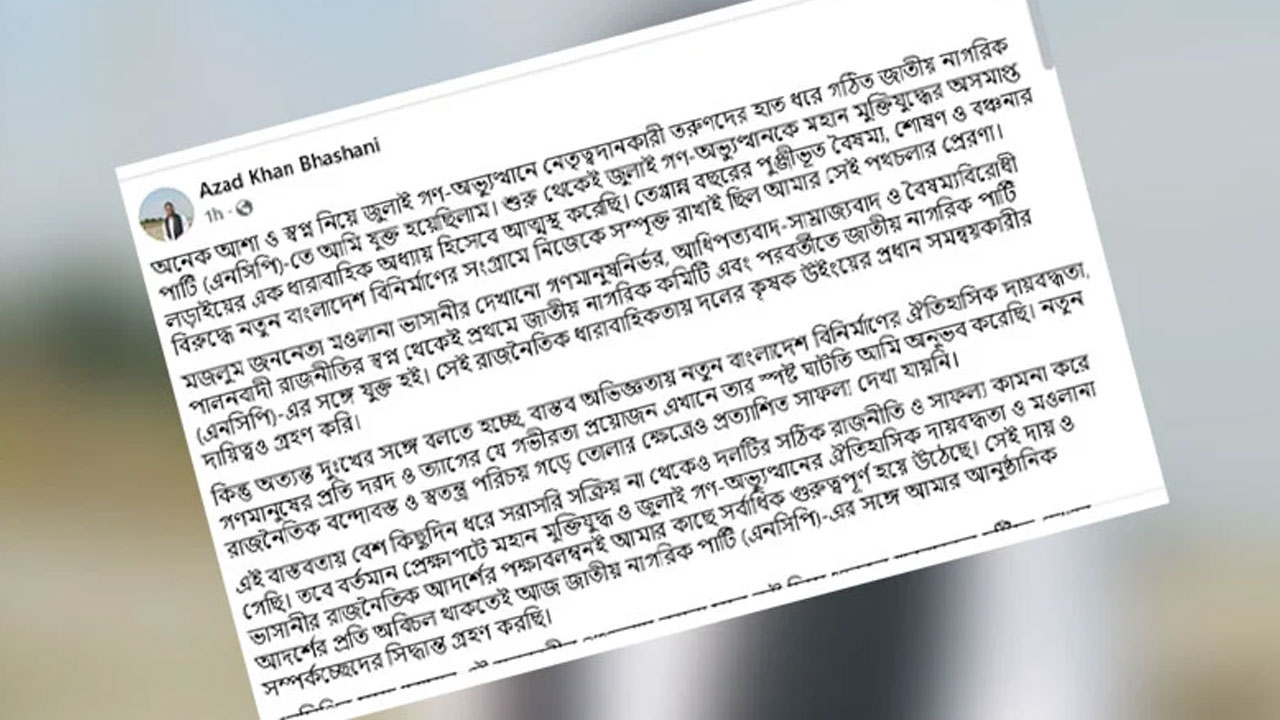 আজাদ খান ভাসানী তার ফেইসবুক পোস্টে বলেন, অনেক আশা ও স্বপ্ন নিয়ে জুলাই গণ-অভ্যুত্থানে নেতৃত্বদানকারী তরুণদের হাত ধরে গঠিত জাতীয় নাগরিক পার্টিতে (এনসিপি) আমি যুক্ত হয়েছিলাম। শুরু থেকেই জুলাই গণ-অভ্যুত্থানকে মহান মুক্তিযুদ্ধের অসমাপ্ত লড়াইয়ের এক ধারাবাহিক অধ্যায় হিসেবে আত্মস্থ করেছি। তেপ্পান্ন বছরের পুঞ্জীভূত বৈষম্য, শোষণ ও বঞ্চনার বিরুদ্ধে নতুন বাংলাদেশ বিনির্মাণের সংগ্রামে নিজেকে সম্পৃক্ত রাখাই ছিল আমার সেই পথচলার প্রেরণা।