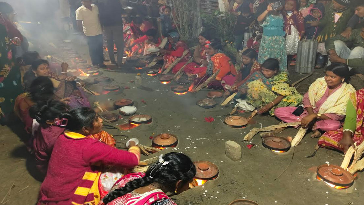 সন্ধ্যা ৭টার দিকে পুরোহিত দেবলাল চক্রবর্তী মন্ত্রপাঠ শুরু করলে আনুষ্ঠানিকভাবে উৎসবের সূচনা হয়। তিনি প্রতিটি চুলায় আগুন জ্বালিয়ে দিলে নারীরা পিঠা বানাতে শুরু করেন। সরা তুলে সাজ থেকে পিঠা নামিয়ে বড় পাত্রে জমা করা হয়। পরে সেই পিঠা প্রতিমার ভোগে অর্পণ শেষে প্রসাদ হিসেবে উপস্থিত সবার মধ্যে বিতরণ করা হয়। বিশেষ করে মানত নিয়ে আসা পুণ্যার্থীদের হাতে তুলে দেওয়া হয় চিতই পিঠা।