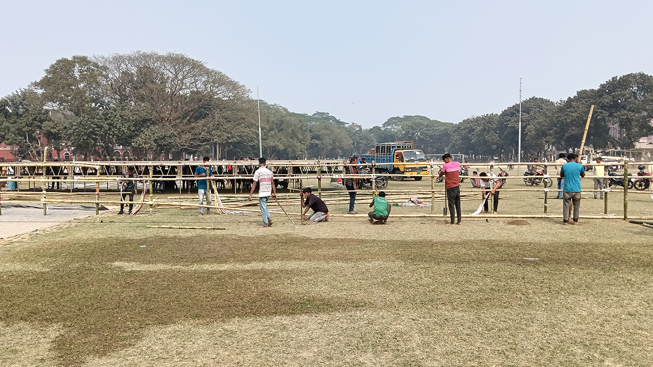 এদিন বিকেলে সরেজমিনে মঞ্চ তৈরির কাজ পরিদর্শনে গিয়ে দেখা যায়, ব্যস্ত সময় পার করছেন মঞ্চের নির্মাণ শ্রমিকরা। পাশাপাশি চলছে বিদ্যুৎ সংযোগসহ মঞ্চের চারপাশে বেরিকেট তৈরির কাজও।