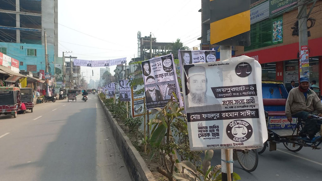 সরেজমিনে দেখা গেছে, শহরের জিরো পয়েন্ট থেকে ফোর লেন সড়ক বিভাজকের পূর্ব দিকে বাসস্ট্যান্ড পর্যন্ত জয়পুরহাট-১ (সদর ও পাঁচবিবি) আসনের বিএনপির দলীয় প্রার্থী মাসুদ রানা প্রধান ও জামায়াতের দলীয় প্রার্থী ফজলুর রহমান সাঈদের ফেস্টুন আড়াআড়ি ভাবে দেওয়া হয়েছে। এসব ফেস্টুনে খুঁটি দিয়ে সড়ক বিভাজকের মাটিতে পুঁতে দেওয়া হয়েছে। ফেস্টুনগুলোতে নির্বাচনী এলাকা উল্লেখ করে প্রার্থীদের দলীয় প্রতীক, ছবি ও নাম লেখা রয়েছে।