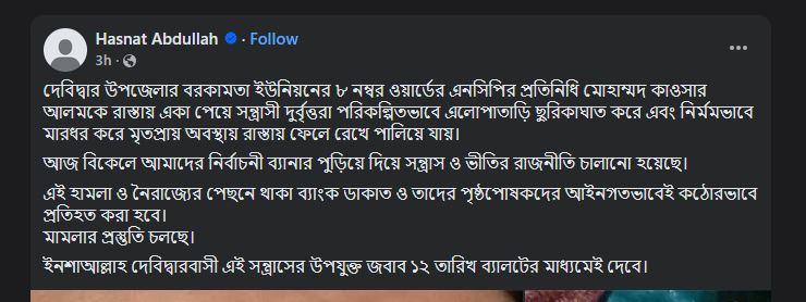 ফেসবুক পোস্টে হাসনাত লিখেছেন, দেবিদ্বার উপজেলার বরকামতা ইউনিয়নের ৮ নম্বর ওয়ার্ডের এনসিপির প্রতিনিধি মোহাম্মদ কাওসার আলমকে রাস্তায় একা পেয়ে সন্ত্রাসী দুর্বৃত্তরা পরিকল্পিতভাবে এলোপাতাড়ি ছুরিকাঘাত করে এবং নির্মমভাবে মারধর করে মৃতপ্রায় অবস্থায় রাস্তায় ফেলে রেখে পালিয়ে যায়।