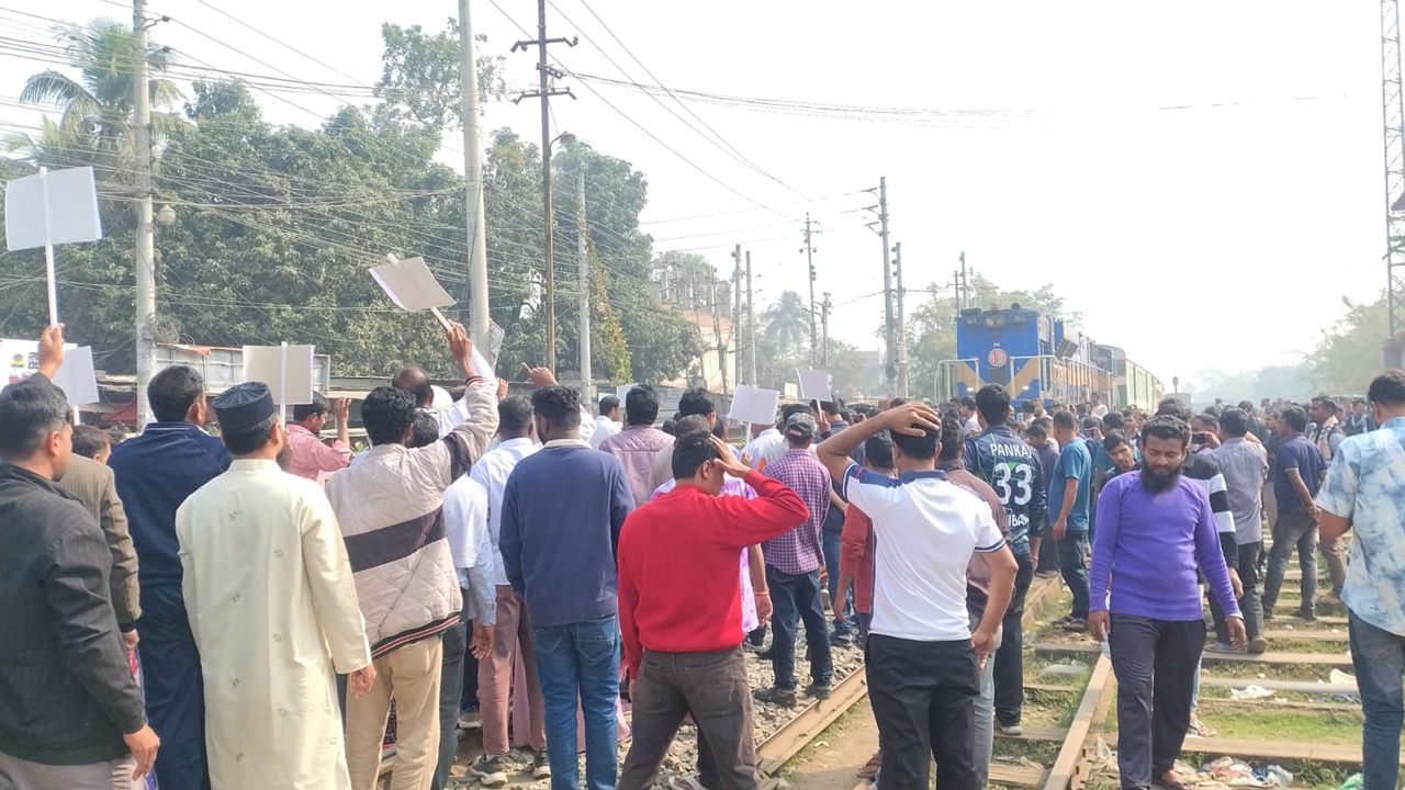 রাজবাড়ীতে ট্রেন আটকে রেলওয়ে শ্রমিকদের বিক্ষোভ