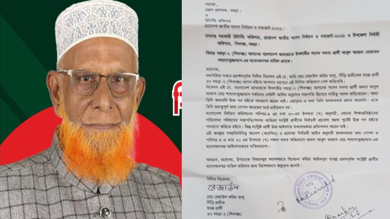 বগুড়া-২ (শিবগঞ্জ) আসনে জামায়াতে ইসলামী মনোনীত সংসদ সদস্য প্রার্থী আবুল আজাদ মোহাম্মদ শাহাদাতুজ্জামানের মনোনয়ন বাতিলের আবেদন জানিয়ে উপজেলা ও রিটার্নিং কর্মকর্তার কাছে লিখিত অভিযোগ করা হয়েছে। স্বতন্ত্র প্রার্থী রেজাউল করিম তালু মঙ্গলবার (৩ ফেব্রুয়ারি) এ অভিযোগ দাখিল করেন।