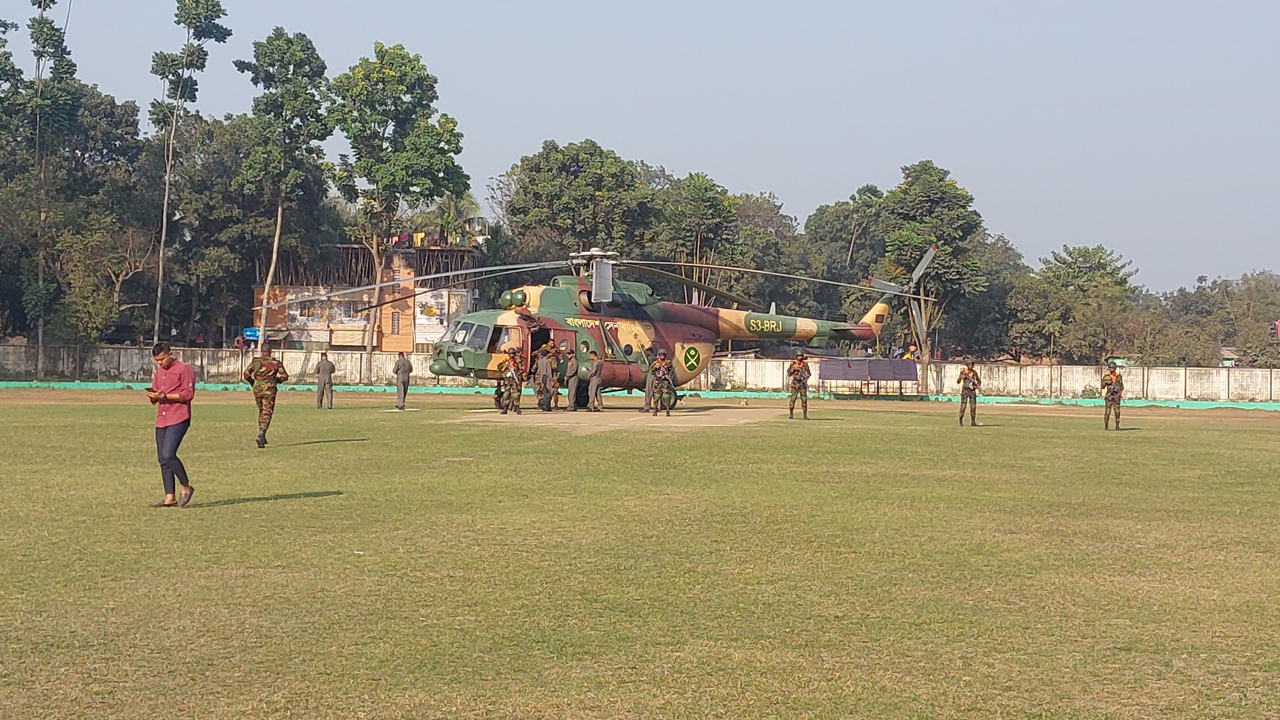মহড়ার অংশ হিসেবে হেলিকপ্টারের মাধ্যমে ১০ সদস্যের একটি প্যারা কমান্ডো দল স্টেডিয়াম মাঠে অবতরণ করে। এ সময় সম্ভাব্য সংকটপূর্ণ পরিস্থিতিতে দ্রুত ঘটনাস্থলে পৌঁছানো, ঝুকিপূর্ণ এলাকা নিয়ন্ত্রণে নেওয়া, সাধারণ মানুষের নিরাপত্তা নিশ্চিত করা এবং পরিস্থিতি স্বাভাবিক করার বিভিন্ন কৌশল প্রদর্শন করা হয়। বিশেষ করে জেলার প্রত্যন্ত অঞ্চলের কোনো ভোটকেন্দ্রে অস্থিতিশীলতা সৃষ্টি হলে কীভাবে হেলি ড্রপের মাধ্যমে দ্রুত অভিযান পরিচালনা করা হবে, তার বাস্তবসম্মত অনুশীলন দেখানো হয়।