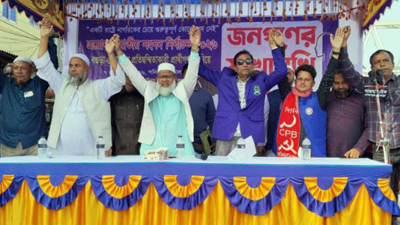 ত্রয়োদশ জাতীয় সংসদ নির্বাচনে বগুড়া-৫ (শেরপুর-ধুনট) আসনের প্রতিদ্বন্দ্বী প্রার্থীরা এক মঞ্চে দাঁড়িয়ে জনকল্যাণমূলক শাসন ব্যবস্থা গড়ে তোলার অঙ্গীকার করেছেন। একইসঙ্গে স্থানীয় সমস্যা সমাধান, রাস্তা-ঘাট উন্নয়ন, বিদ্যুতায়ন, কর্মসংস্থান সৃষ্টি, শিক্ষা ব্যবস্থার উন্নয়ন, নারী ক্ষমতায়ন এবং সন্ত্রাস, চাঁদাবাজি ও মাদক নিয়ন্ত্রণে ঐক্যবদ্ধভাবে কাজ করার প্রত্যয়ও ব্যক্ত করেন তারা।
