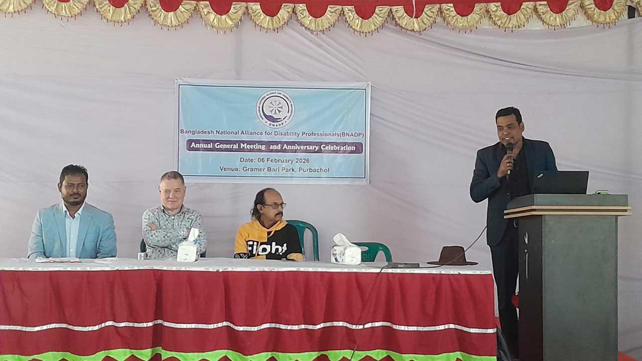 রাজধানীর অদূরে পূর্বাচলের ‘গ্রামের বাড়ি পার্ক’-এ গত শুক্রবার (৬ ফেব্রুয়ারি) বাংলাদেশ ন্যাশনাল অ্যালায়েন্স ফর ডিজেবিলিটি প্রফেশনালস (বিএনএডিপি)-এর বর্ষপূর্তি ও বার্ষিক সাধারণ সভা অনুষ্ঠিত হয়েছে। দিনব্যাপী আয়োজিত এই অনুষ্ঠানে সংগঠনের নতুন কার্যনির্বাহী কমিটি গঠন এবং প্রতিবন্ধী ব্যক্তিদের অধিকার রক্ষায় ভবিষ্যৎ কর্মপরিকল্পনা নিয়ে আলোচনা করা হয়।