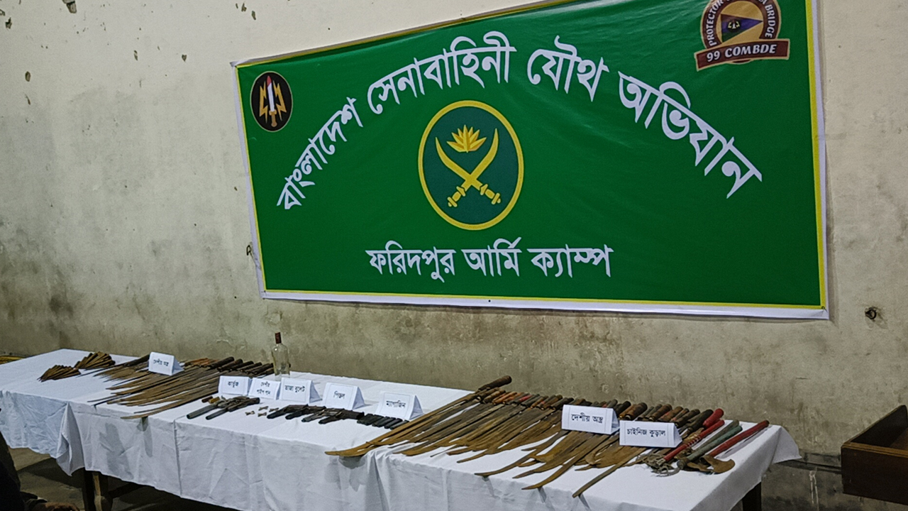 ফরিদপুর সদর উপজেলার কানাইপুর ইউনিয়নের কানাইপুর বাজারের পাশে একটি পুকুরে ডুবিয়ে রাখা স্কচটেপে মোড়ানো অবস্থায় চারটি পিস্তল, ১৮ রাউন্ড গুলিসহ দুই শতাধিক দেশীয় অস্ত্র উদ্ধার করেছে যৌথ বাহিনী। এসব অস্ত্র নির্বাচনের দিন ব্যবহারের পরিকল্পনা ছিল বলে জানান ফরিদপুর সেনা ক্যাম্পের লেফটেন্যান্ট কর্নেল মিনহাযুল আবেদীন।