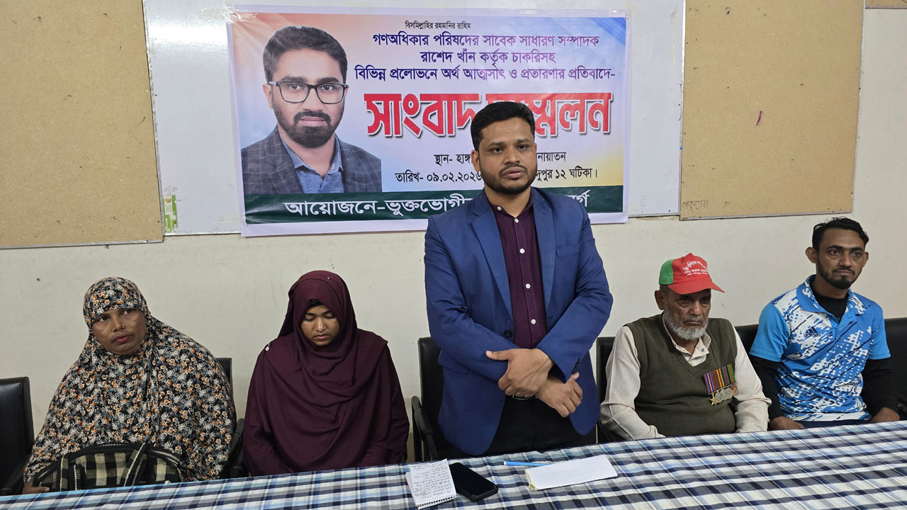 গণঅধিকার পরিষদের সাবেক সাধারণ সম্পাদক ও ঝিনাইদহ-৪ আসনে বিএনপি মনোনীত প্রার্থী রাশেদ খাঁনের বিরুদ্ধে চাকরিসহ বিভিন্ন প্রলোভনে অর্থ আত্মসাৎ ও প্রতারণার অভিযোগ উঠেছে। সোমবার (৯ ফেব্রুয়ারি ) দুপুর ১২টার দিকে কালীগঞ্জ শহরের একটি মিলনায়তনে সংবাদ সম্মেলেনে ভুক্তভোগী পরিবারের সদস্যরা এসব অভিযোগ করেন। তারা বিএনপির চেয়ারম্যান তারেক রহমানের হস্তক্ষেপ কামনা করেন।