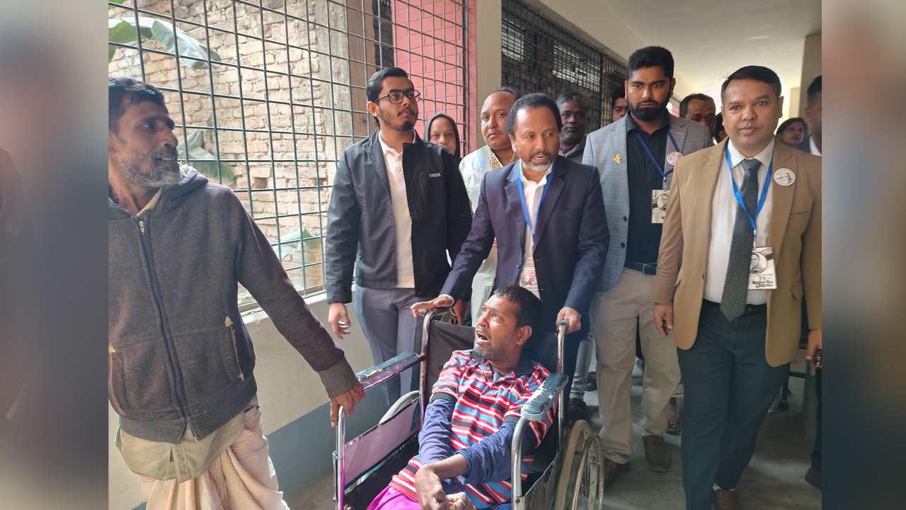 সিরাজগঞ্জে হুইলচেয়ারে এসে ভোট দিলেন ৪১ বছর বয়সী জুয়েল