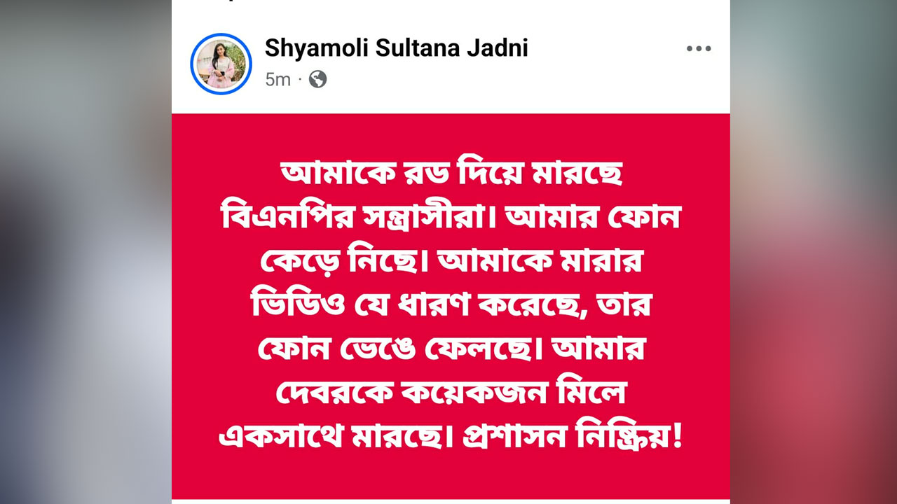 শ্যামলী সুলতানা জেদনী নিজের ফেসবুক আইডিতে লিখেছেন, আমাকে রড দিয়ে মেরেছে বিএনপির সন্ত্রাসীরা। আমার ফোন কেড়ে নিয়েছে। আমাকে মারার ভিডিও যে ধারণ করেছে, তার ফোন ভেঙে ফেলেছে। আমার দেবরকে কয়েকজন মিলে এক সঙ্গে মেরেছে। প্রশাসন নিষ্ক্রিয়!
