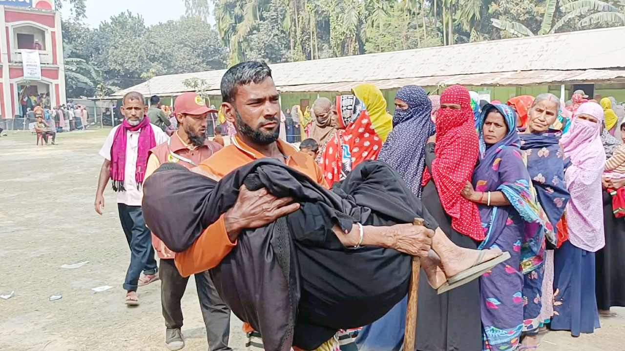 বৃহস্পতিবার (১২ ফেব্রুয়ারি) দুপুর ১২টার দিকে কুড়িগ্রাম সদর উপজেলার ভোগডাঙ্গা মডেল কলেজ কেন্দ্রে এমন আবেগঘন দৃশ্যের দেখা মেলে। নাতি এরশাদুল হক তার নানি আছিমন বেওয়াকে কোলে নিয়ে ভোটকেন্দ্রে প্রবেশ করেন।