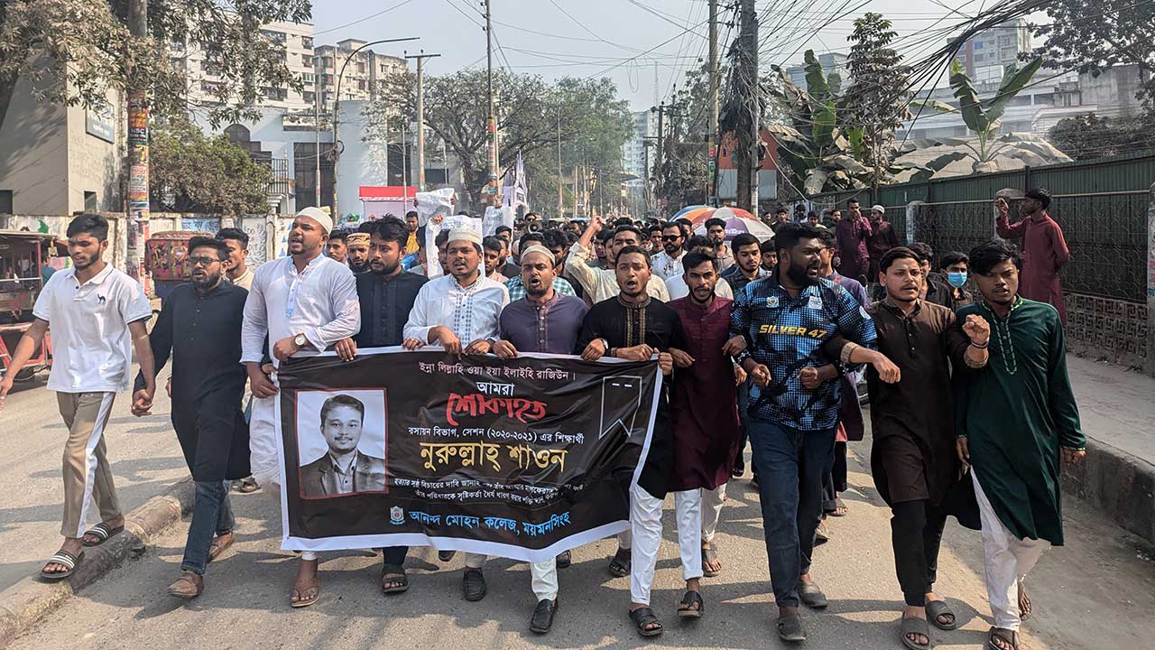 এর আগে নগরীর আনন্দ মোহন কলেজ ও বিশ্ববিদ্যালয় মাঠে নিহত শিক্ষার্থী নূরুল্লাহ শাওনের জানাজার নামাজ শেষে বিক্ষুব্ধ শিক্ষার্থীরা একটি বিক্ষোভ মিছিল বের করে নগরীর বিভিন্ন সড়ক প্রদিক্ষণ করে। এ সময় বিক্ষোভকারীরা আসামিদের দ্রুত গ্রেপ্তারের দাবি জানান।