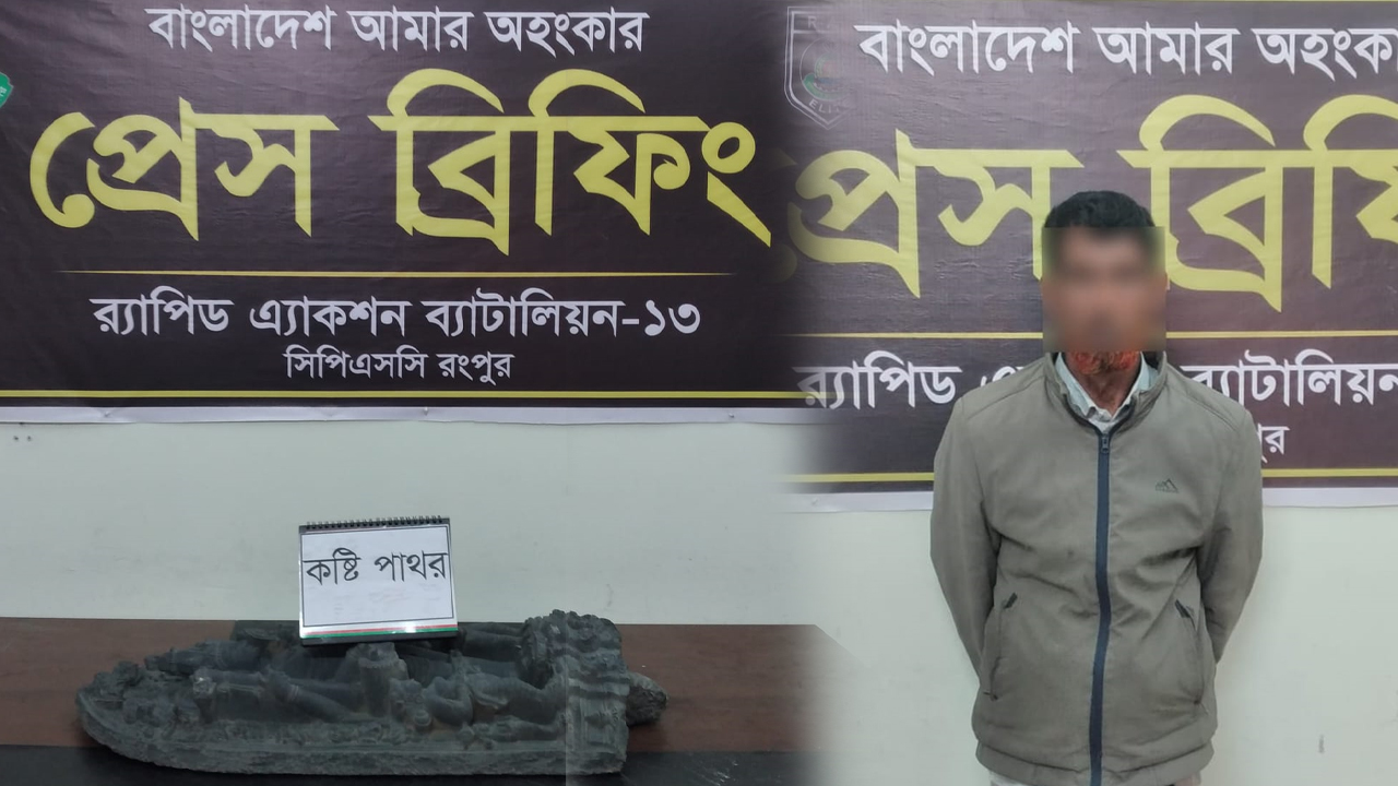 উত্তরের সীমান্তবর্তী জেলা ঠাকুরগাঁওয়ে ভোররাতের এক অভিযানে কোটি টাকার কষ্টিপাথরের একটি মূর্তি উদ্ধার করেছে র্যাপিড অ্যাকশন ব্যাটালিয়ন (র্যাব)। এ ঘটনায় মো. লালা মিয়া (৬০) নামে এক বৃদ্ধকে আটক করা হয়েছে।