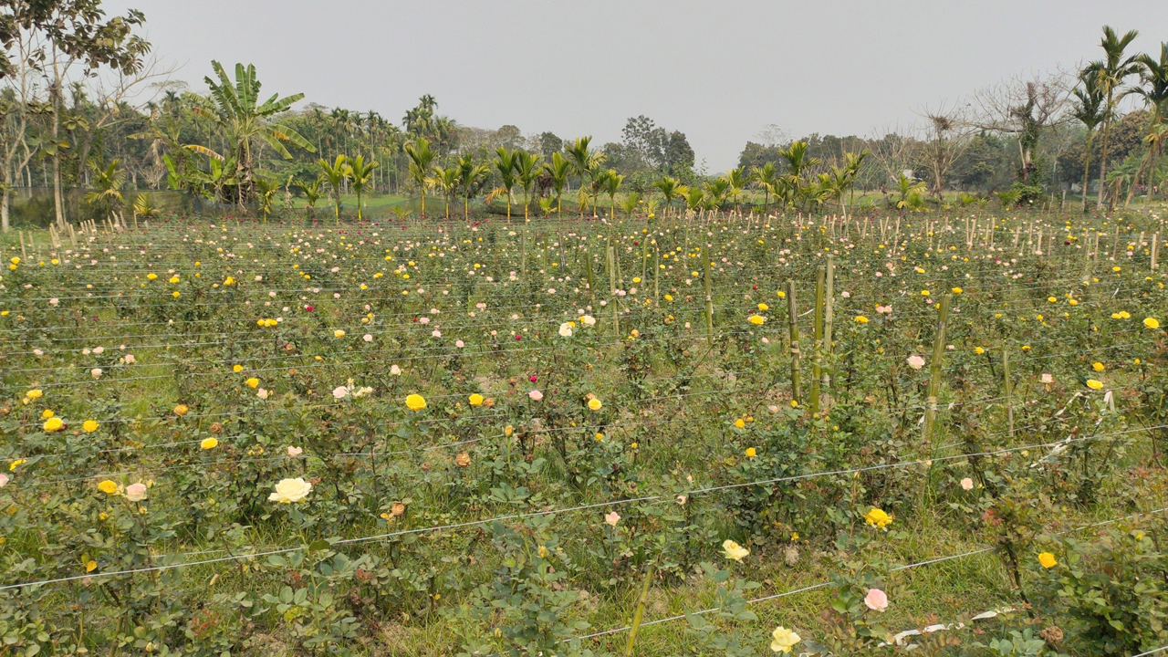 বিলজুড়ে লাল, হলুদ আর গোলাপি রঙের সমারোহ। দূর থেকে দেখলে মনে হবে যেন রঙের কার্পেট বিছানো। কাছে গেলেই ভেসে আসে গোলাপের মনোমুগ্ধকর সুবাস। এটি কোনো পর্যটনকেন্দ্র নয়, এটি তরুণ উদ্যোক্তা এস এম রাকিবের স্বপ্নের বাগান।