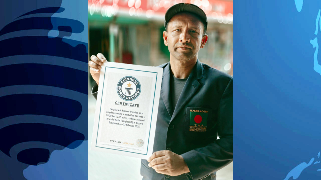 মাগুরার শালিখা উপজেলার শতখালী ইউনিয়নের ছয়ঘরিয়া গ্রামের বাসিন্দা আবদুল হালিম। মাথায় ফুটবল রেখে ঘণ্টার পর ঘণ্টা হাঁটা, সাইকেল চালানো কিংবা স্কেটিং করার মতো নানা কসরতে পারদর্শী তিনি। গত বছরের রেকর্ড গড়ার সময় তার মাথার ওপর ছিল একটি ফুটবল এবং দুই হাত ছিল সাইকেলের হ্যান্ডেলে। এভাবে তিনি একটানা ১ ঘণ্টা ৪৯ মিনিট সাইকেল চালিয়ে ২০ দশমিক ২০ কিলোমিটার পথ অতিক্রম করেন। পুরো সময়জুড়ে একবারের জন্যও বলটি মাথা থেকে পড়ে যায়নি।