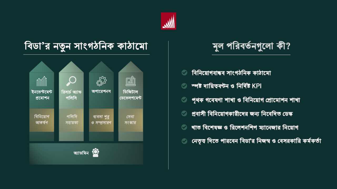 নতুন কাঠামো সাজানো হয়েছে ইনভেস্টমেন্ট লাইফ সার্কেলের সঙ্গে সামঞ্জস্য রেখে। এই কাঠামো অনুযায়ী বিডায় থাকবে পাঁচটি প্রধান অনুবিভাগ বা উইং— ইনভেস্টমেন্ট প্রোমোশন, রিসার্চ অ্যান্ড পলিসি, অপারেশনস, ডিজিটাল ডেভেলপমেন্ট এবং অ্যাডমিনিস্ট্রেশন।
