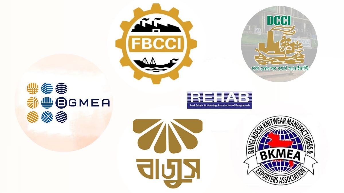 ব্যবসায়ীদের প্রতিনিধিত্ব করা সংগঠনগুলোর মধ্যে– দ্য ফেডারেশন অব বাংলাদেশ চেম্বার্স অব কমার্স অ্যান্ড ইন্ডাস্ট্রি (এফবিসিসিআই), ঢাকা চেম্বার অব কমার্স অ্যান্ড ইন্ডাস্ট্রি (ডিসিসিআই), বাংলাদেশ পোশাক প্রস্তুতকারক ও রপ্তানিকারক সমিতি (বিজিএমইএ), বাংলাদেশ নিটওয়্যার ম্যানুফ্যাকচারার্স অ্যান্ড এক্সপোর্টার্স অ্যাসোসিয়েশন (বিকেএমইএ), বাংলাদেশ জুয়েলার্স অ্যাসোসিয়েশন (বাজুস) এবং রিয়েল এস্টেট অ্যান্ড হাউজিং অ্যাসোসিয়েশন অব বাংলাদেশ (রিহ্যাব) রয়েছে।