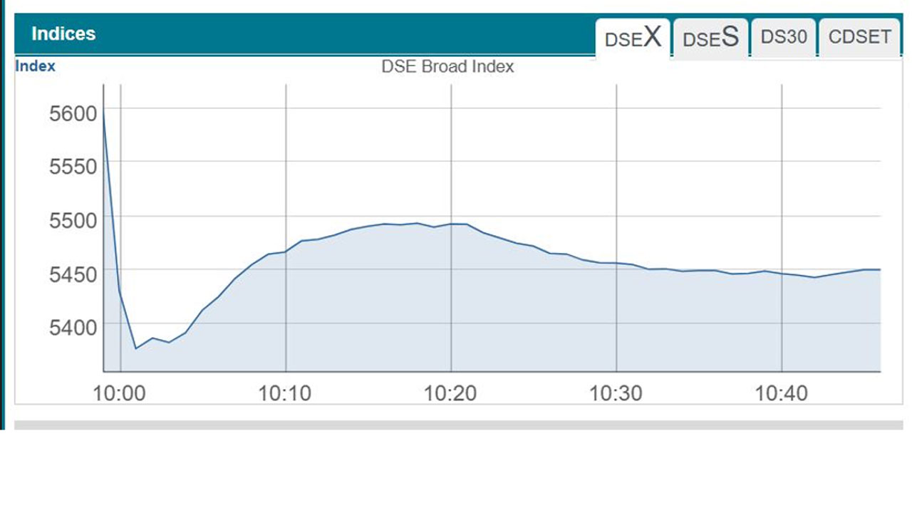 বাজার বিশ্লেষণে দেখা যায়, আজ সকাল ১০টায় লেনদেনের শুরুতেই অধিকাংশ শেয়ারের দাম কমার তালিকায় অংশ নেয়। এতে প্রথম মিনিটেই ডিএসইএক্স সূচক ২২৩ পয়েন্টে কমে যায়। পরে অবশ্য কয়েকটি শেয়ার ও ইউনিট দাম বাড়ার তালিকায় আসে। এতে সূচকের রেকর্ড পতনের ব্যবধান পরে কিছুটা কমতে থাকে।