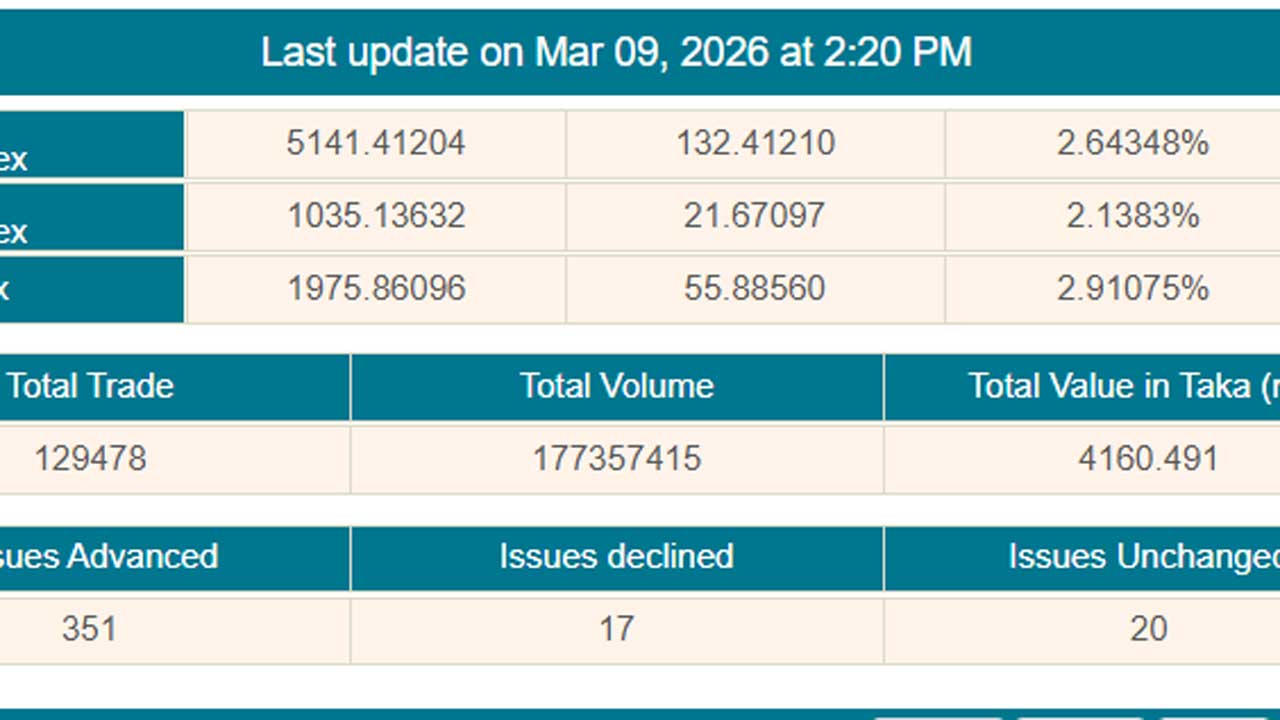 অধিকাংশ প্রতিষ্ঠানের শেয়ার ও ইউনিটের দাম বাড়ায় ডিএসইর প্রধান মূল্যসূচক ডিএসইএক্স আগের দিনের তুলনায় ১৩২ পয়েন্ট বেড়ে ৫ হাজার ১৪১ পয়েন্টে দাঁড়িয়েছে। অন্য দুই সূচকের মধ্যে ডিএসই শরিয়াহ সূচক ২১ পয়েন্ট বেড়ে ১ হাজার ৩৫ পয়েন্টে অবস্থান করছে। আর বাছাই করা ভালো ৩০ কোম্পানি নিয়ে গঠিত ডিএসই-৩০ সূচক আগের দিনের তুলনায় ৫৫ পয়েন্ট বেড়ে ১ হাজার ৯৭৫ পয়েন্টে উঠে এসেছে।