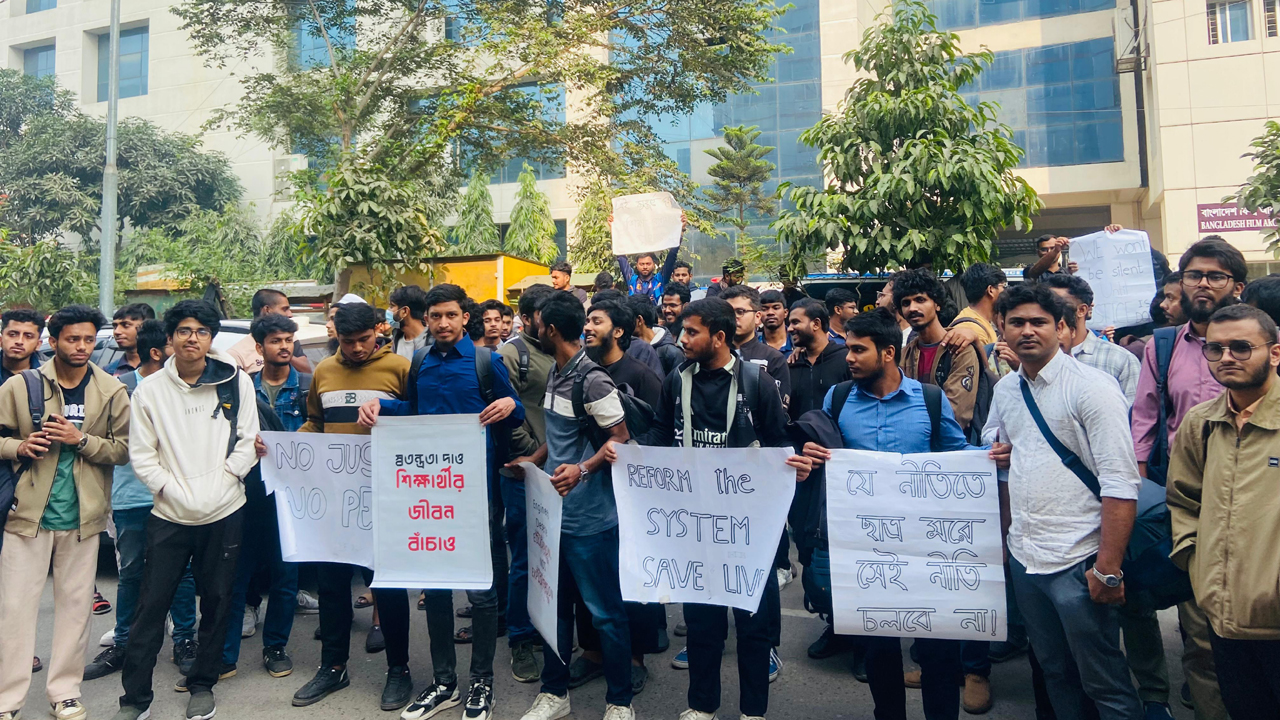 এ সময় শিক্ষার্থীদের ‘স্বতন্ত্রতা দাও, শিক্ষার্থীর জীবন বাঁচাও’, ‘ইঞ্জিনিয়ারস ডিজার্ভ এডুকেশন, নট এক্সপ্লোয়েশন’, ‘রিফর্ম দ্য সিস্টেম, সেভ লাইফ’, ‘যে নীতিতে ছাত্র মরে, সেই নীতি চলবে না’সহ নানা স্লোগান সংবলিত প্ল্যাকার্ড দেখা যায়।
