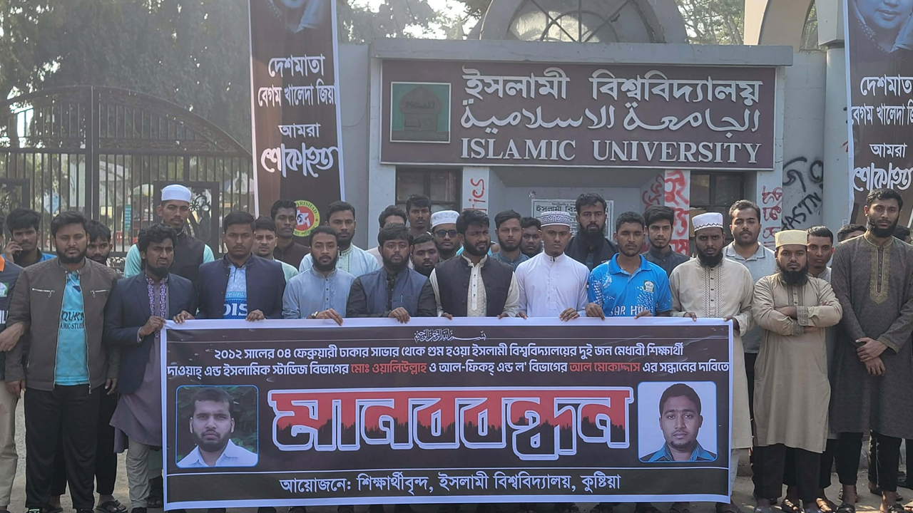 চৌদ্দ বছর আগে ঢাকার সাভার থেকে গুম হওয়া ইসলামী বিশ্ববিদ্যালয়ের দুই শিক্ষার্থীর সন্ধান দাবিতে মানববন্ধন করেছে বিশ্ববিদ্যালয়ের শিক্ষার্থীরা। বুধবার (৪ফেব্রুয়ারি) দুপুর আড়াইটায় বিশ্ববিদ্যালয়ের প্রধান ফটক প্রাঙ্গণে শতাধিক শিক্ষার্থীর অংশগ্রহণে এই মানববন্ধন অনুষ্ঠিত হয়।