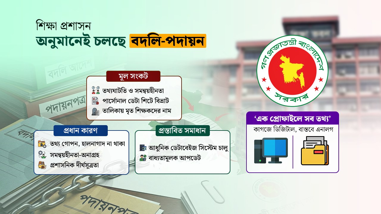 বিভাগ সংশ্লিষ্টরা বলছেন, কাগজে-কলমে শিক্ষা প্রশাসনে ডিজিটালাইজেশনের নানা উদ্যোগের কথা বলা হয়। কিন্তু বাস্তবে পিডিএস ব্যবস্থাকে আধুনিক ও কার্যকর করার কোনো দৃশ্যমান অগ্রগতি নেই। বহুল আলোচিত ‘এক প্রোফাইলেই সব তথ্য’ ধারণাটি এখনো বাস্তবায়নের পর্যায়ে পৌঁছায়নি। ফলে বদলি ও পদায়নের মতো সংবেদনশীল বিষয়ে এখনো নির্ভর করতে হচ্ছে অসম্পূর্ণ ও পুরোনো তথ্যের ওপর। অনলাইন সিস্টেম থাকলেও সেখানে তথ্য না থাকলে বা ভুল থাকলে শেষ পর্যন্ত কাগুজে নথিই ভরসা। এতে একদিকে যেমন সিদ্ধান্ত নিতে সময় বাড়ে, অন্যদিকে ভুল ও বিতর্কের সুযোগও তৈরি হয়।