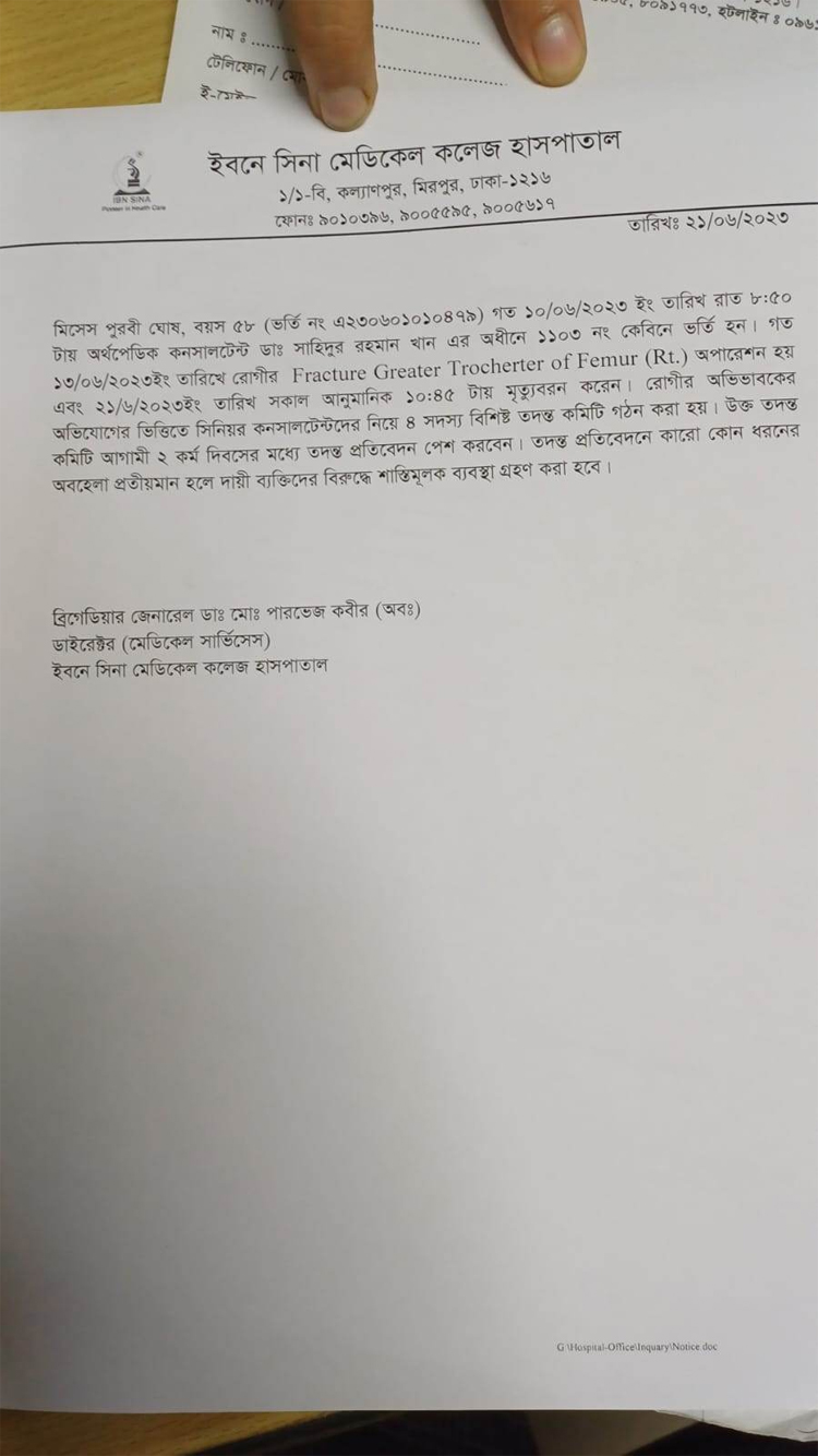 সৌমিত্র ঘোষ ইমনের অভিযোগের বিষয়ে বুধবার দুপুরে ইবনে সিনা মেডিকেল কলেজ হাসপাতালের উপপরিচালক ডা. মেজর (অব.) মিজানুর সংবাদমাধ্যমকে বলেন, ‘বিষয়টি আমরা আজই নোটিশ করেছি। ওনার অর্থোপেডিকসের একটি অস্ত্রোপচার হয়েছিল। ইতোমধ্যে আমরা রোগী পূরবী ঘোষের মৃত্যুর বিষয়ে তদন্ত কমিটি গঠন করেছি। সংশ্লিষ্ট সব ডক্টর, নার্স, স্টাফকে আমরা ডেকেছি। কী ঘটেছে আমরা খুঁজে বের করার চেষ্টা করছি। হাসপাতালে এখনো রোগীর স্বজনরা রয়েছেন, তাদের সঙ্গে কথা বলছি। তদন্ত করে দু-এক দিনের মধ্যে বিস্তারিত আমরা জানাব।’