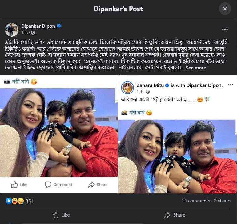 তাই বিষয়টি নিয়ে মঙ্গলবার রাতেই এক দীর্ঘ স্ট্যাটাস দেন দীপংকর দীপন। যেখানে তিনি জানান, মিতুর এই পোস্ট তার পারিবারিক ও ব্যক্তিগত জীবনে কতটা প্রভাব ফেলেছে।