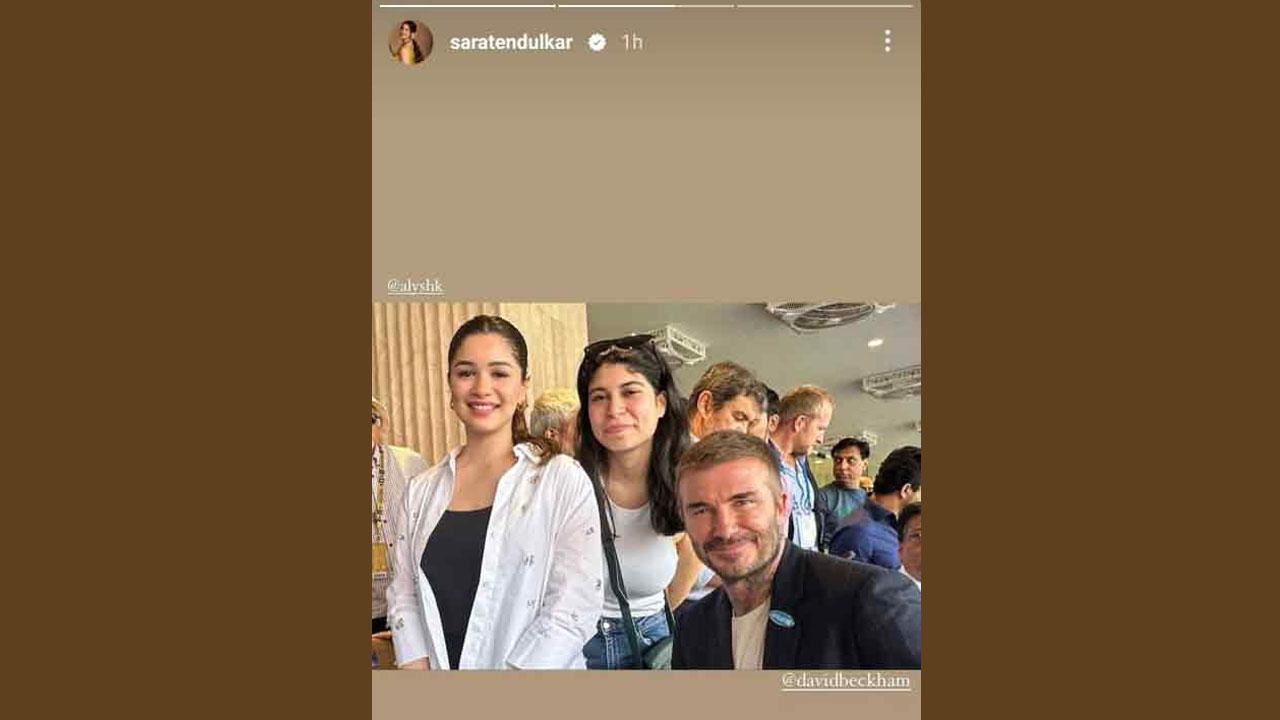 বুধবার মাঠে বসে ভারতের জয় দেখেছেন সারা। সেই ম্যাচ দেখতে এসেছিলেন প্রাক্তন ফুটবলার ডেভিড বেকহ্যাম। তখনই স্টেডিয়ামে দেখা হয় সারা এবং বেকহ্যামের। ইংল্যান্ডের প্রাক্তন ফুটবলারকে সামনে পেয়ে তার সঙ্গে ছবি তোলার সুযোগ হাতছাড়া করেননি সারা। সেই ছবি বৃহস্পতিবার পোস্ট করলেন সোশ্যাল সাইটে।