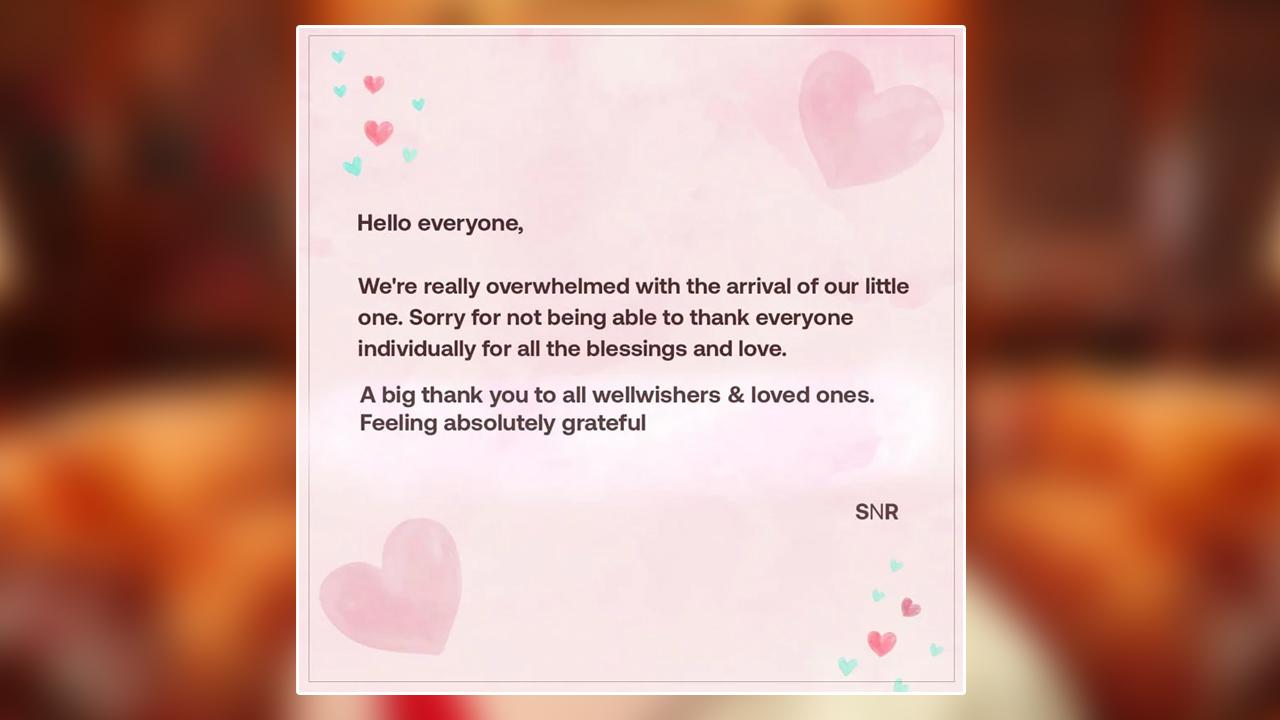 ফেসবুকে অভিনেত্রী লেখেন, আমাদের পরিবারে এই খুদে সদস্যের আগমনে আমি সত্যিই অভিভূত। এত ভালোবাসা ও আশীর্বাদের জন্য সবাইকে ব্যক্তিগতভাবে ধন্যবাদ জানাতে পারছি না তার জন্য দুঃখিত। আমাদের সমস্ত শুভাকাঙ্ক্ষী ও কাছের মানুষদের অনেক অনেক ধন্যবাদ। আমরা অত্যন্ত কৃতজ্ঞ।