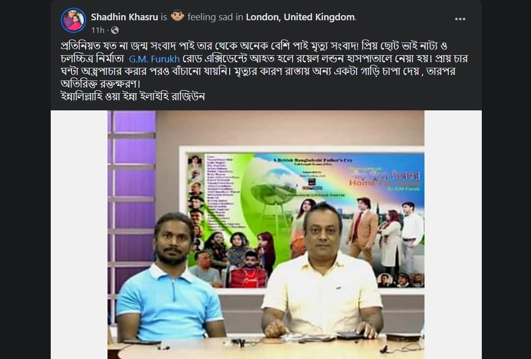 রোববার রাতে জিএম ফুরুখের সঙ্গে নিজের একটি ছবি পোস্ট করে মৃত্যুর বিষয়টি জানান অভিনেতা খসরু।