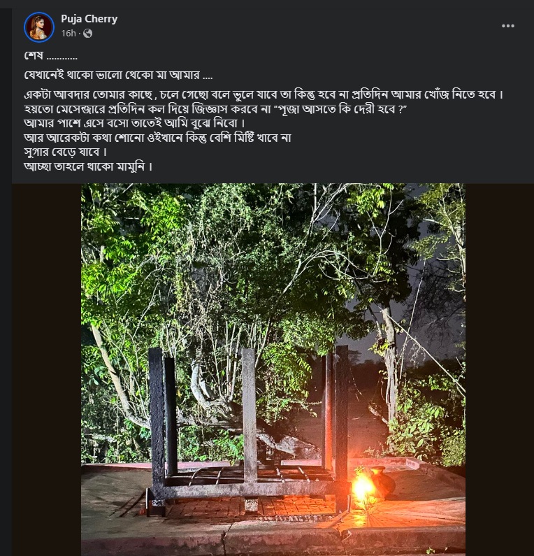 রোববার মাঝ রাতে ফেসবুকে ছবি পোস্ট করে ক্যাপশনে পূজা লেখেন, ‘শেষ...। যেখানেই থাকো, ভালো থেকো মা আমার। একটা আবদার তোমার কাছে , চলে গেছো বলে ভুলে যাবে, তা কিন্তু হবে না। প্রতিদিন আমার খোঁজ নিতে হবে।’