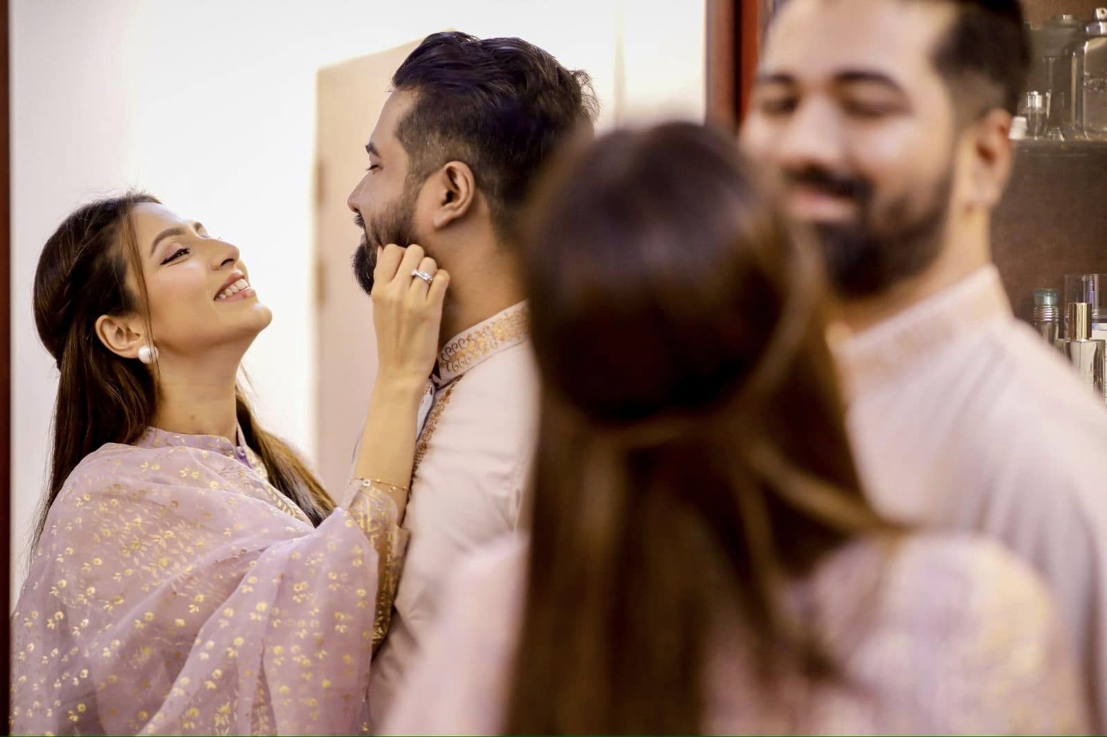 ছবিতে দেখা যায়, জুটির পরনে একই রঙের পোশাক। সোনালি কারুকাজে হালকা বেগুনি রঙের শাড়ি পরেছেন মিম। সঙ্গে একই রঙের পাঞ্জাবিতে স্বামী সনি পোদ্দার। পাশাপাশি দাঁড়িয়ে দুজনের মিষ্টি আলিঙ্গনের সঙ্গে ক্যামেরায় পোজ দিলেন এই জুটি। ঈদ শুভেচ্ছা জানিয়ে ক্যাপশনে মিম লিখেছেন ‘ঈদ মুবারক’। এতে রীতিমতো মুগ্ধতা ও ভালোবাসা প্রকাশ করেন মিমের ভক্ত-অনুরাগীরা। মন্তব্য ঘরে তারা অভিনেত্রীকে জানান ঈদের শুভেচ্ছা।