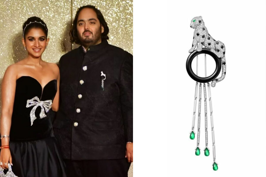 দ্য প্যান্থার ডি কার্টিয়ার ব্রোচ: রাধিকার সঙ্গে বাগদানের দিন ভাই আকাশ অম্বানীর দেওয়া একটি ব্রোচ পরেছিলেন অনন্ত, যা তৈরি হয়েছিল ১৯১৪ সালে। রাজস্থানের শ্রীনাথজি মন্দিরে রাধিকার সঙ্গে ‘রোকা’ অনুষ্ঠান সম্পন্ন হয় অনন্তের। সেই অনুষ্ঠানে অনন্তের কালো গলাবন্ধ পোশাকের উপর শোভা পেয়েছিল এই ব্রোচটি।