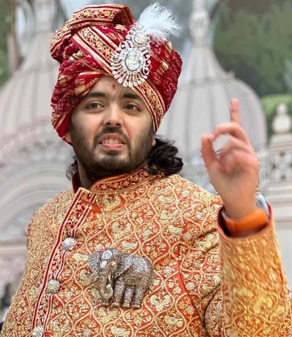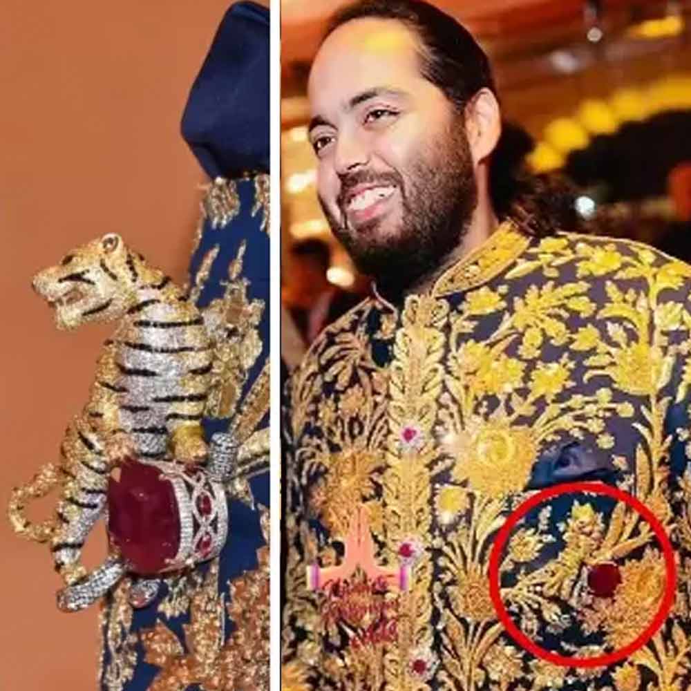 ক্রিস্টাল বসানো ফুলেল নকশা করা ঘন নীল রঙের শেরওয়ানি পরেছিলেন অনন্ত। সোনা দিয়ে তৈরি রয়্যাল বেঙ্গল টাইগার, গায়ে বসানো কালো এবং সাদা বহুমূল্য পাথর। সঙ্গে গোলাপি রঙের পাথর বসানো একটি পালকের প্রতিকৃতি। নয় নয় করে সেই ব্রোচটির দামও কয়েক কোটির উপর।