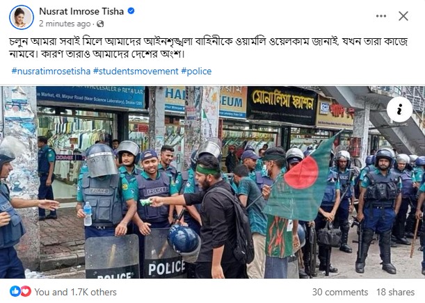 ছবিটির ক্যাপশনে তিশা লেখেন, 'চলুন আমরা সবাই মিলে আমাদের আইনশৃঙ্খলা বাহিনীকে ওয়ার্মলি ওয়েলকাম জানাই, যখন তারা কাজে নামবে। কারণ তারাও আমাদের দেশের অংশ।'
