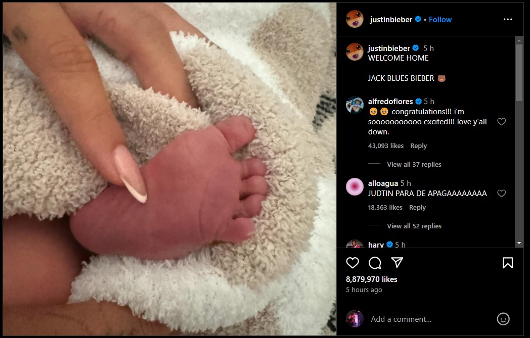 শনিবার সকালে ইনস্টাগ্রামে নবাগত সন্তানের পায়ের ছবি পোস্ট করেন এই কানাডিয়ান তারকা। লিখেছেন, ‘বাড়িতে তোমায় স্বাগত জানাচ্ছি।’ সঙ্গে একটি নামও জুড়ে দেন, ‘জ্যাক ব্লুজ বিবার’।