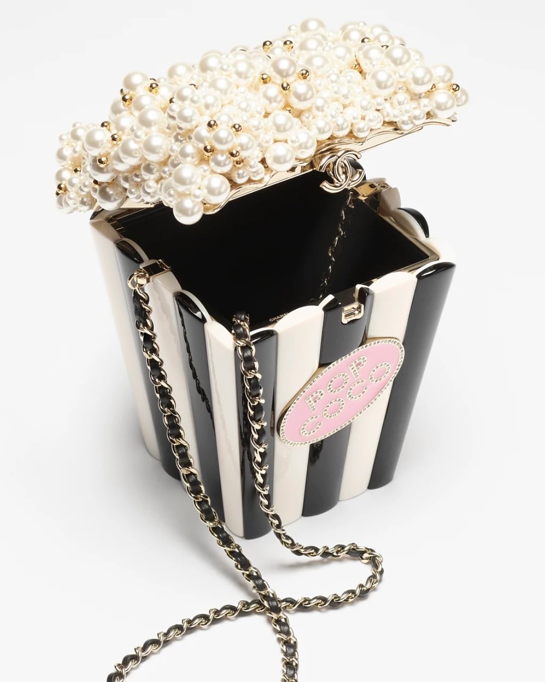 নীতা আম্বানির হাতে যে পপকর্ন ব্যাগ দেখা যাচ্ছে সেটা পপকর্ন বাকেটের আদলে তৈরি। সাদা কালো বাজেটের উপর গোলাপি রং দিয়ে লেখা পপ কোকো। উপর পপকর্নের বদলে দেখা যাচ্ছে মুক্তা। এই ব্যাগটির দাম ২৪ লাখ টাকা।