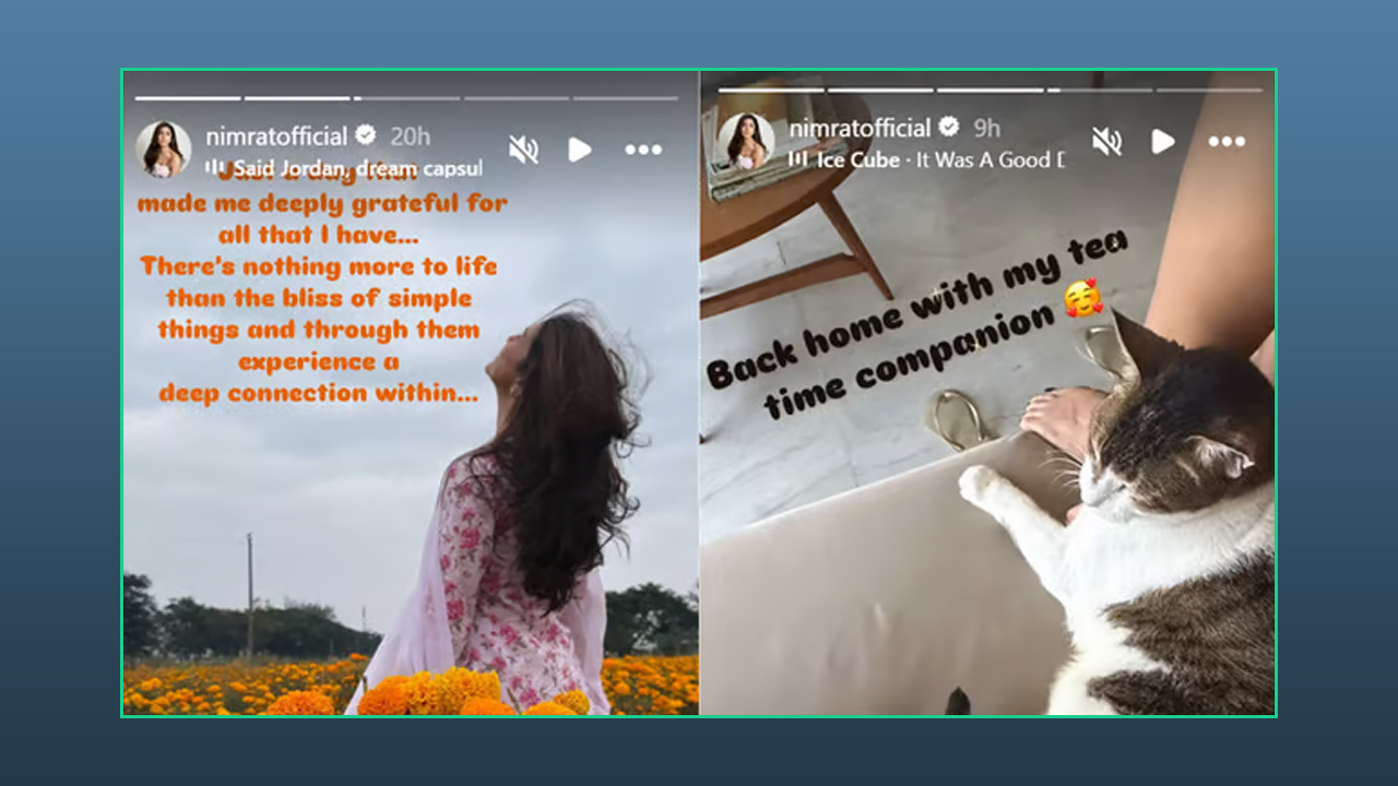 নিমরত তার ইনস্টাগ্রামে একটা স্টোরি পোস্ট করেছেন। যেখানে দেখা গেছে, বিড়ালের সঙ্গে বসে রয়েছেন তিনি। আর সেই পোস্টেই লিখলেন, ‘বাড়ি ফিরলাম। চায়ের সঙ্গীর সঙ্গে বসে রয়েছি।’