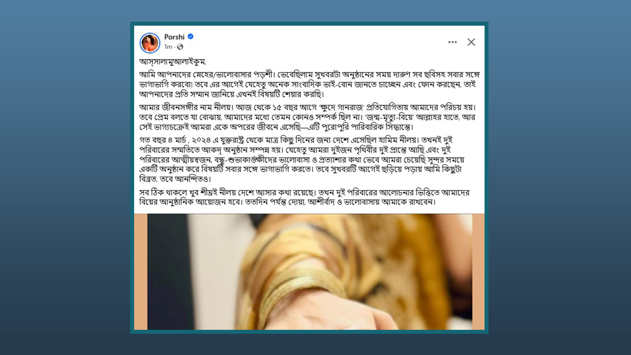 ‘আসসালামু আলাইকুম, আমি আপনাদের স্নেহের/ভালোবাসার পড়শী। ভেবেছিলাম সুখবরটা অনুষ্ঠানের সময় দারুণ সব ছবিসহ সবার সঙ্গে ভাগাভাগি করবো! তবে এর আগেই যেহেতু অনেক সাংবাদিক ভাই-বোন জানতে চাচ্ছেন এবং ফোন করছেন, তাই আপনাদের প্রতি সম্মান জানিয়ে এখনই বিষয়টি শেয়ার করছি।