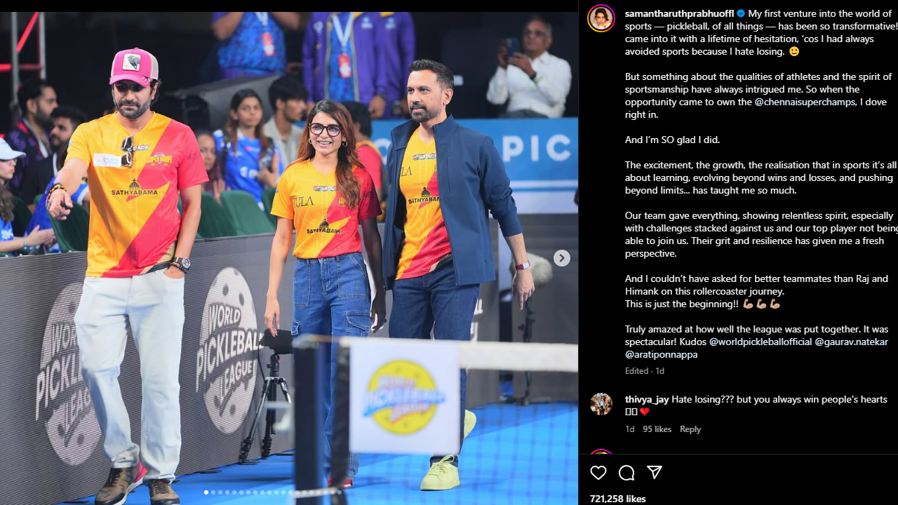 এদিকে সামাজিক যোগাযোগ মাধ্যমে সামান্থা কিছু ছবি শেয়ার করেছেন। যেখানে দেখা যায়, ওয়ার্ল্ড পিকলবল লিগ ম্যাচে নিদিমোরুর সঙ্গে হাজির হন সামান্থা। দু’জনের পোশাকের মধ্যেও ছিল একই রঙের ছোঁয়া।